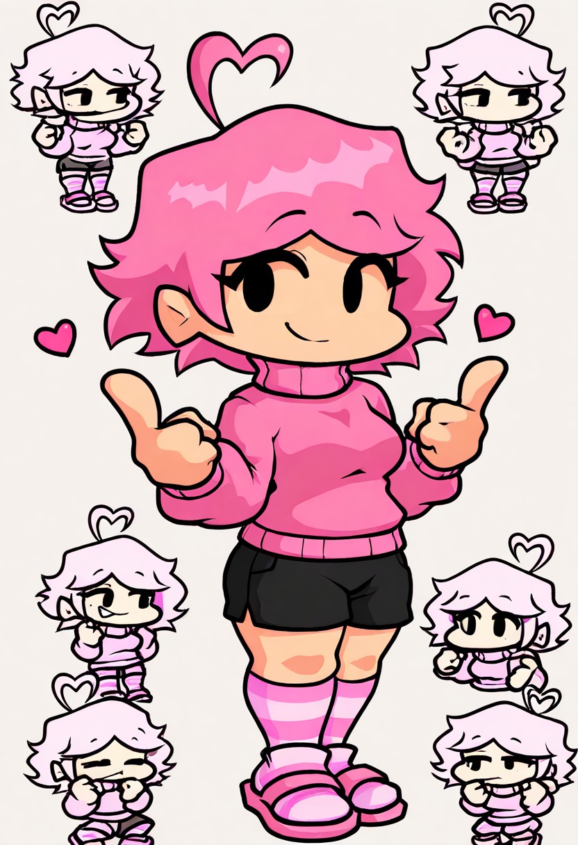 black eyes, no sclera, no nose, thick lines, simple shading, big head, chibi