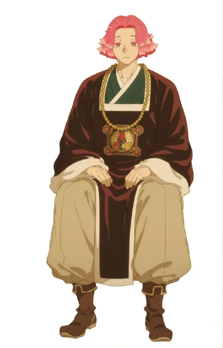 Mu DanHPV1, pink hair, yellow eyes, beads, necklace, jewelry, long sleeves, robe, green kimono, chinese clothes, japanese clothes, pants, boots, brown footwear