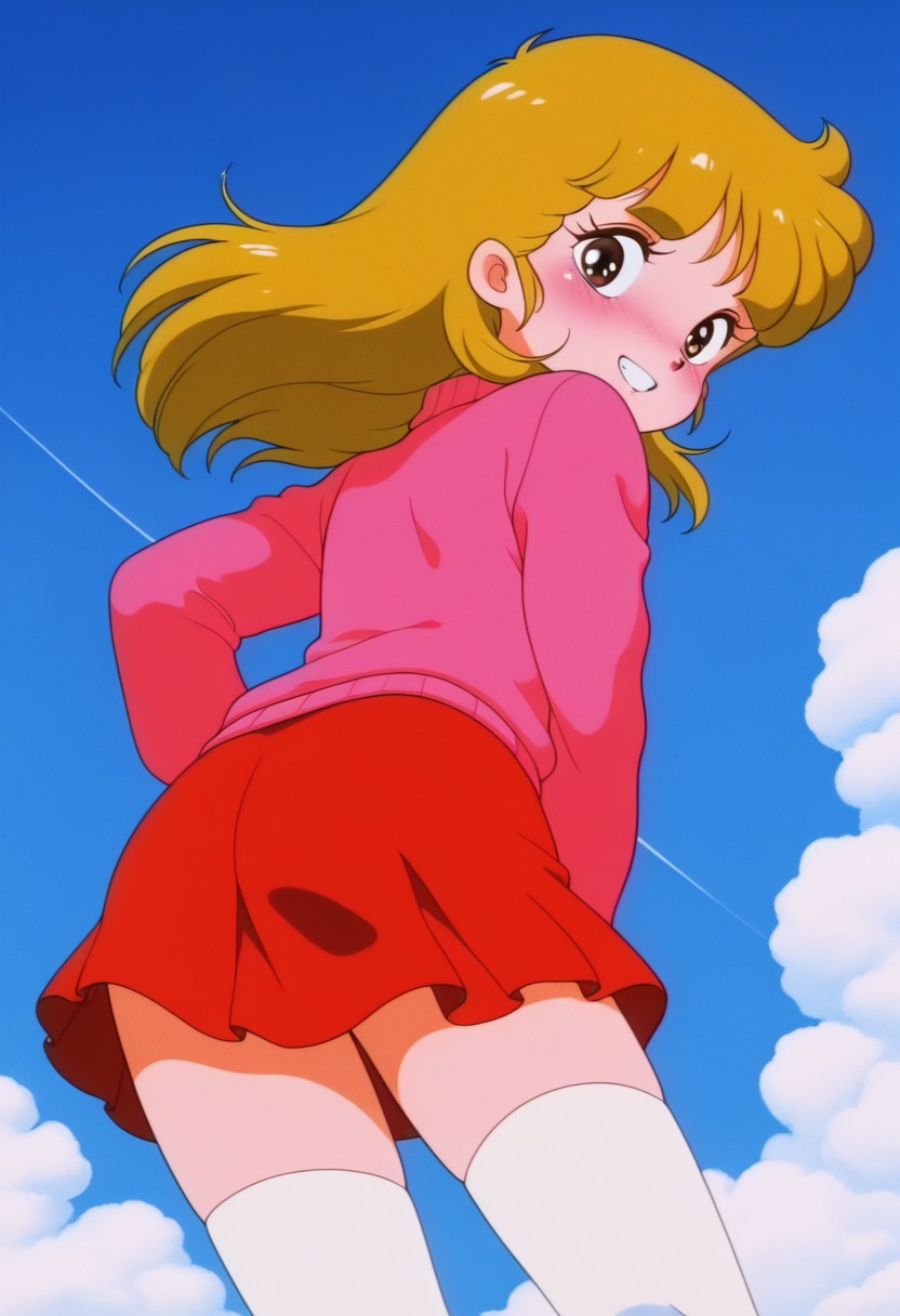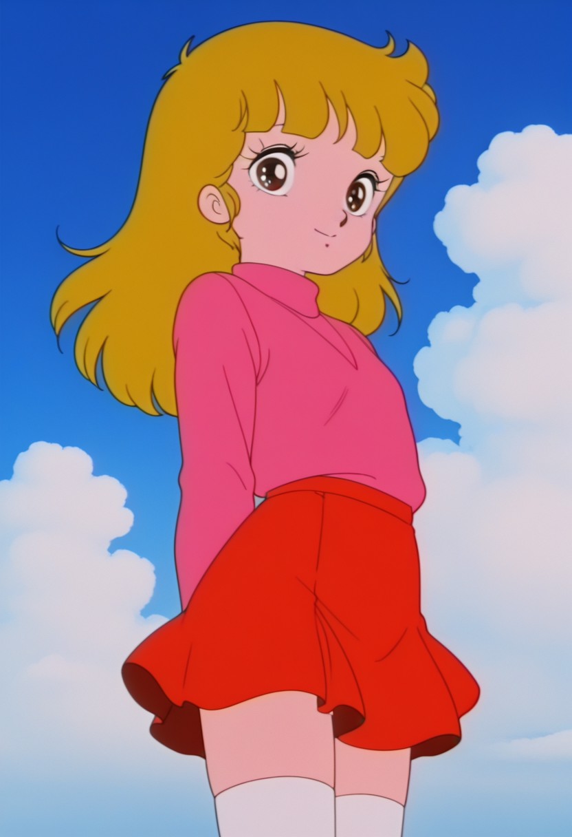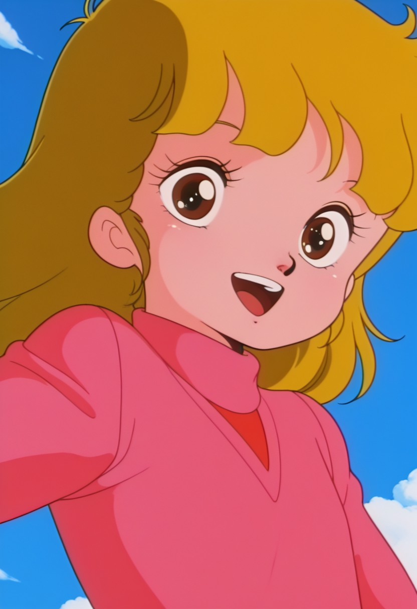 ・젊은 마코, 갈색 눈, 금발, 분홍색 스웨터