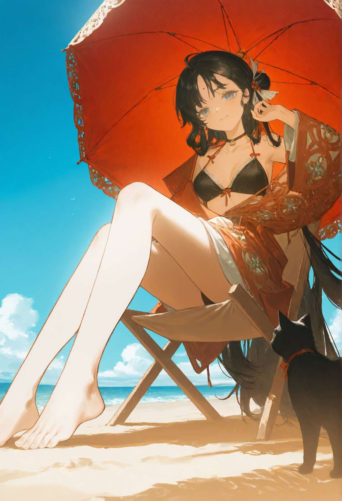 lushijian2, 1girl, solo, black hair, very long hair, hair bun, hair ornament, hair stick, hair flower, parted bangs, forehead mark, blue eyes, jewelry, red robe, red dress, white sash, short over long sleeves, layered sleeves, asymmetrical sleeves, sleeves past elbows, white pants, pants tucked in, black footwear