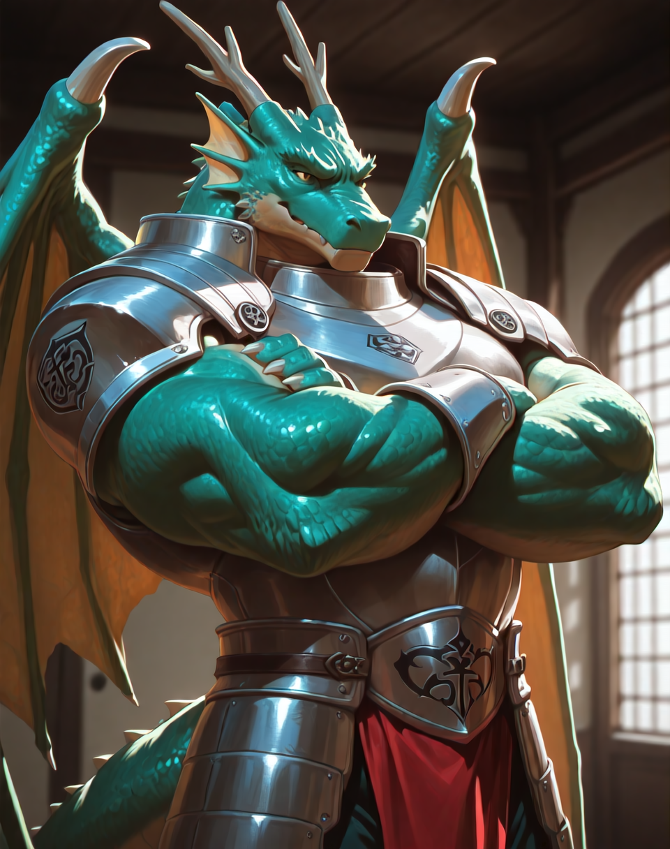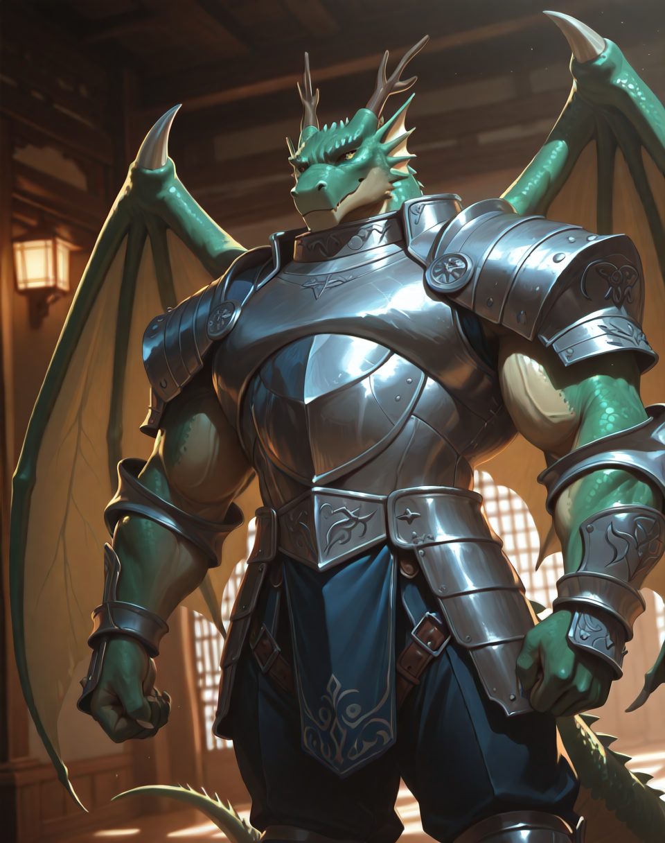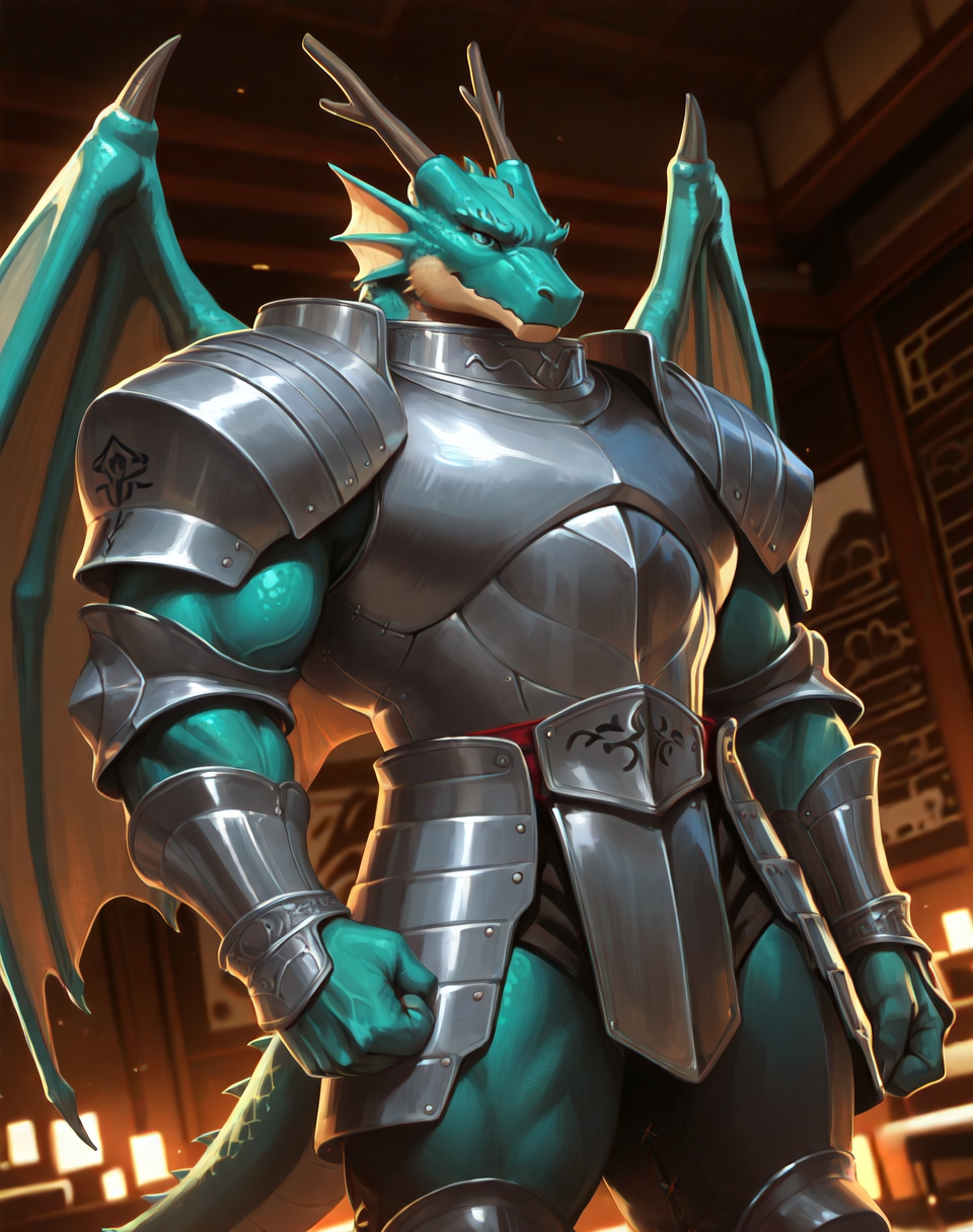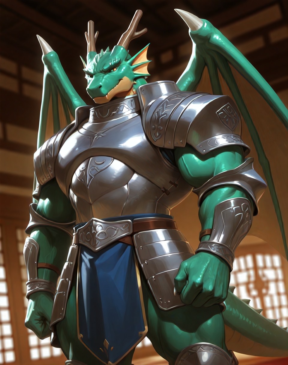 このLoRA用のプロンプトは次の通りです:(Lazarus, muscular, dragon, armor, )