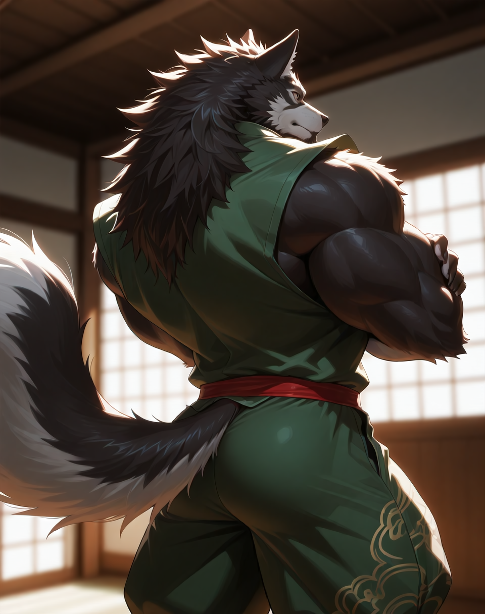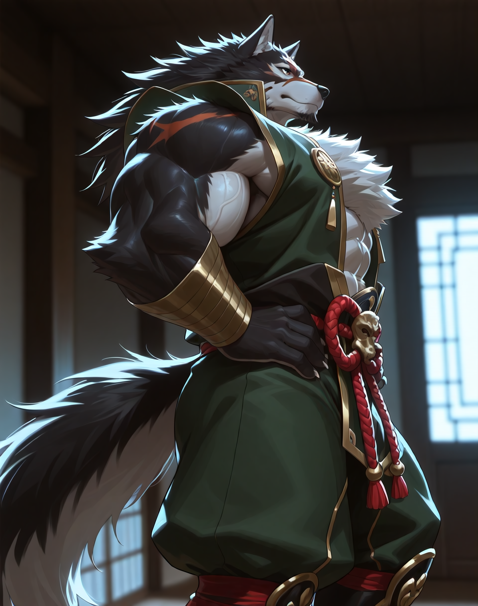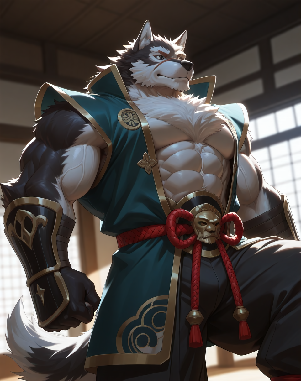 このLoRA向けのプロンプトは(Rouen, muscular, wolf, )です。