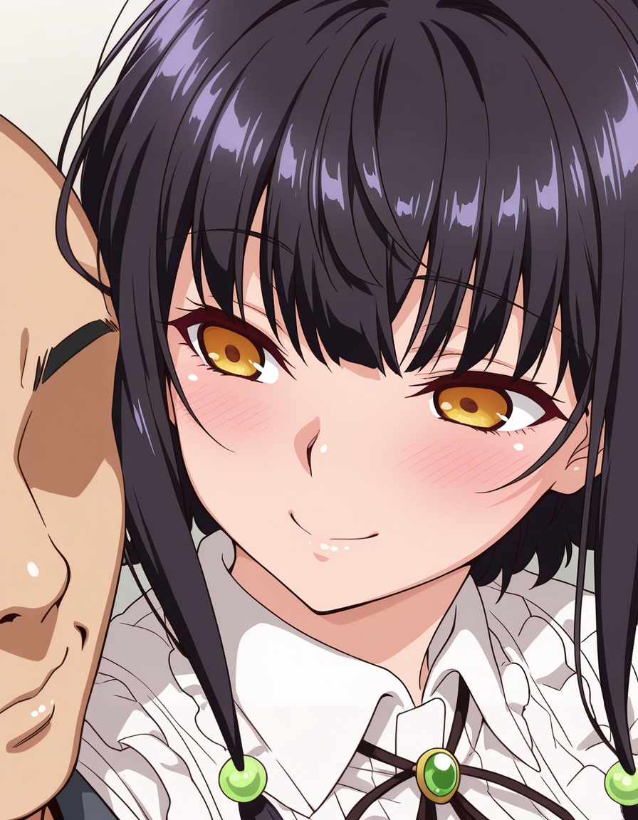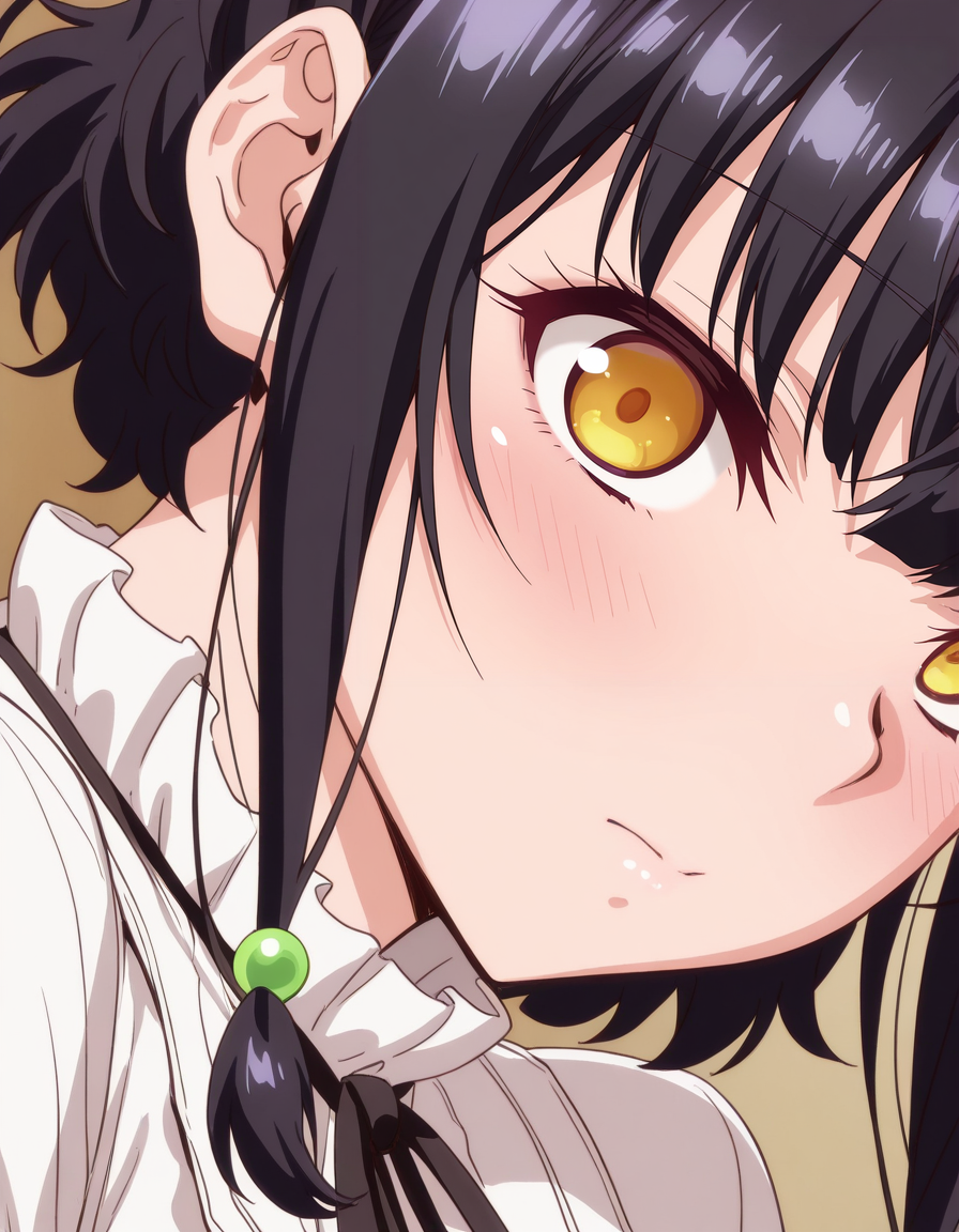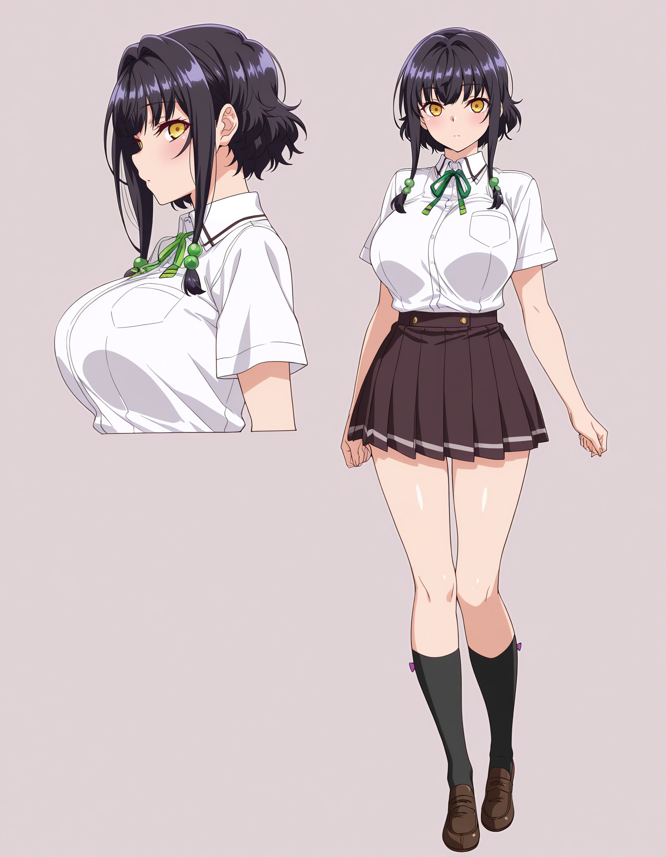mai_karento,short_hair_with_long_locks,hair_intakes,low-tied_sidelocks,black_hair,yellow_eyes,hair_beads,green_beads,school_uniform,collared_shirt,white_shirt,short_sleeves,wing_collar,green_neck_ribbon,pleated_skirt,black_kneehighs,loafers