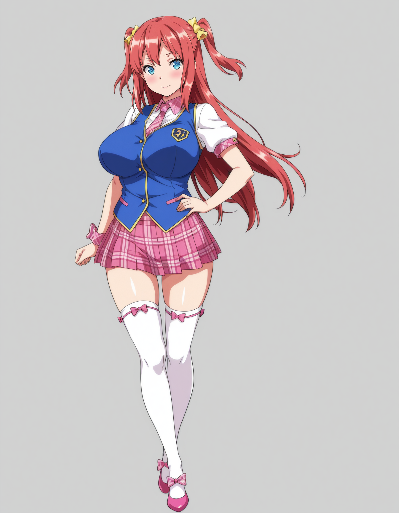mai_honamiim,long_hair,two_side_up,red_hair,blue_eyes,large_breasts,hair_ornament,idol,blue_vest,necktie,short_sleeves,white_thighhighs,pleated_skirt,plaid_skirt,pink_skirt,pink_footwear,footwear_bow
