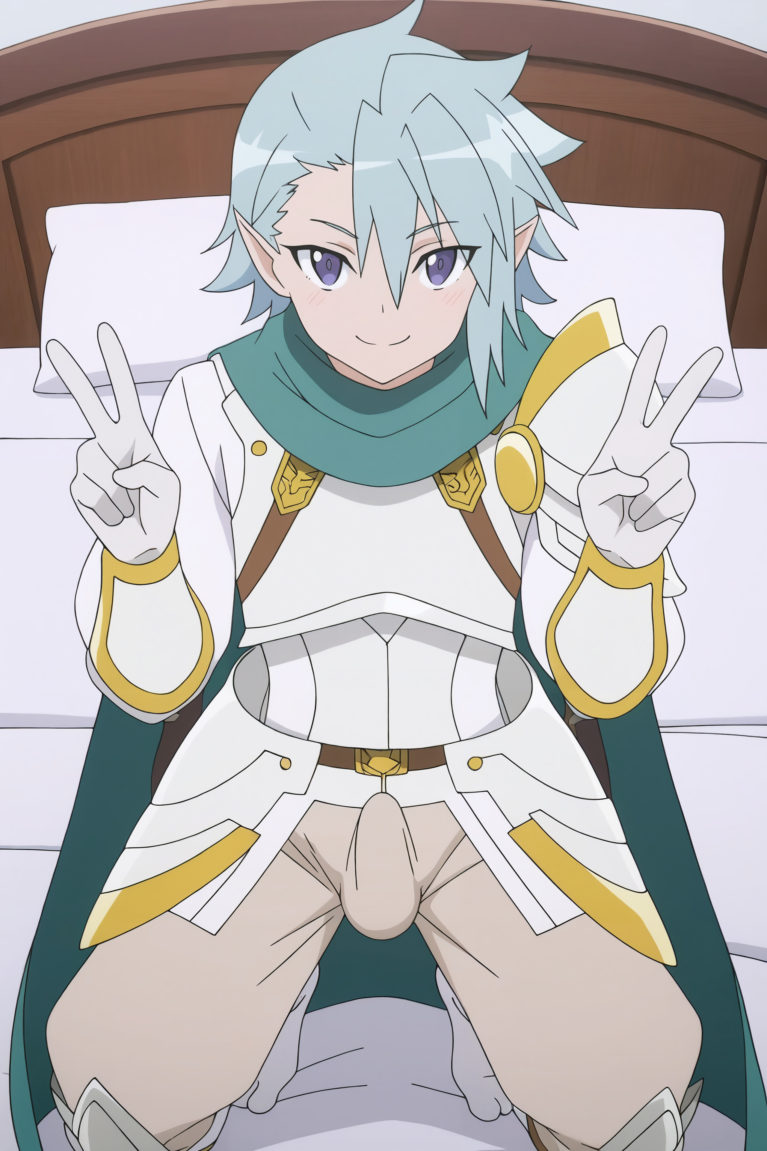 Kia, light blue hair, pointed ears, purple eyes, white armor (with golden trim), teal scarf, teal cloak, white gloves, beige pants, white armor boots