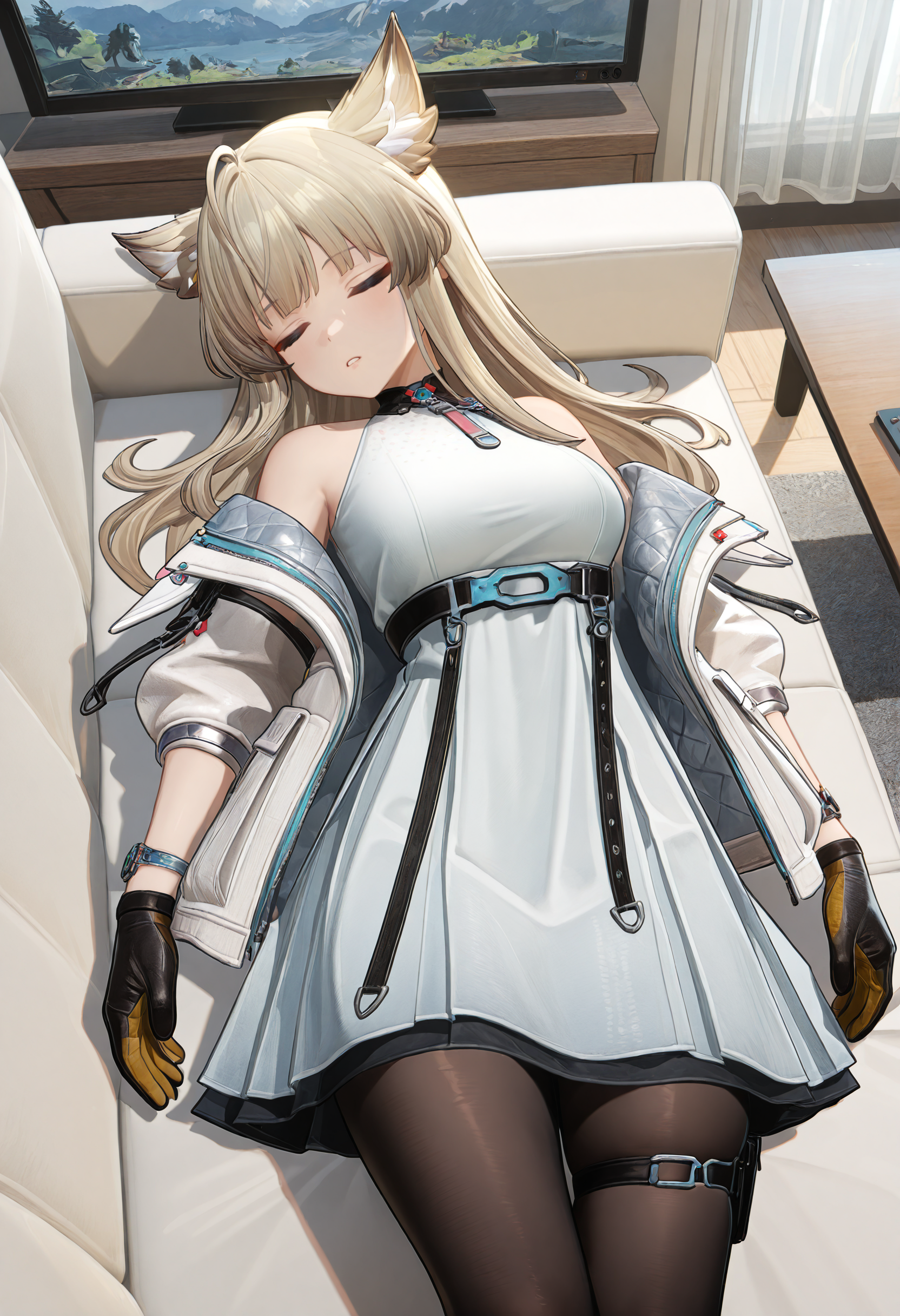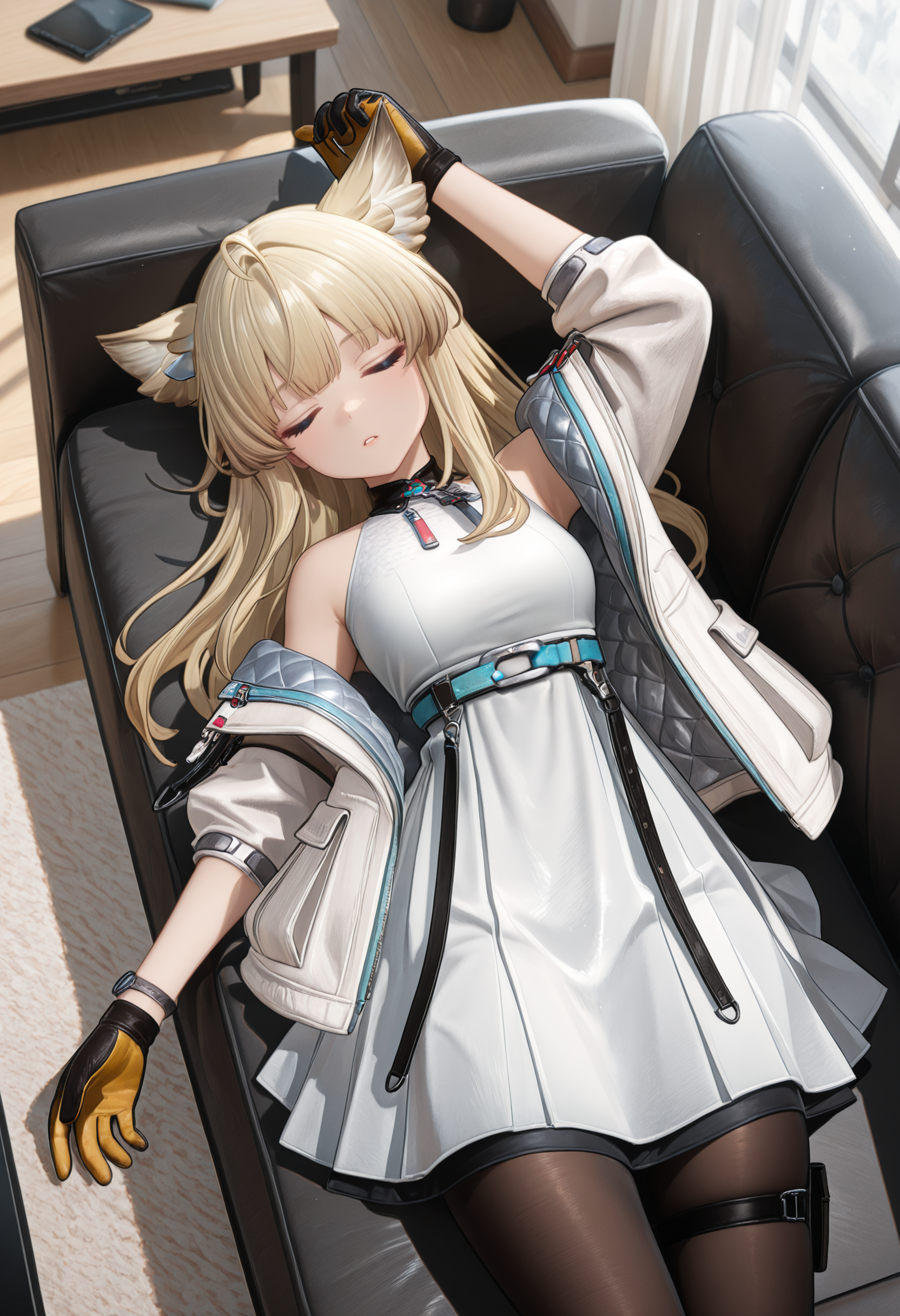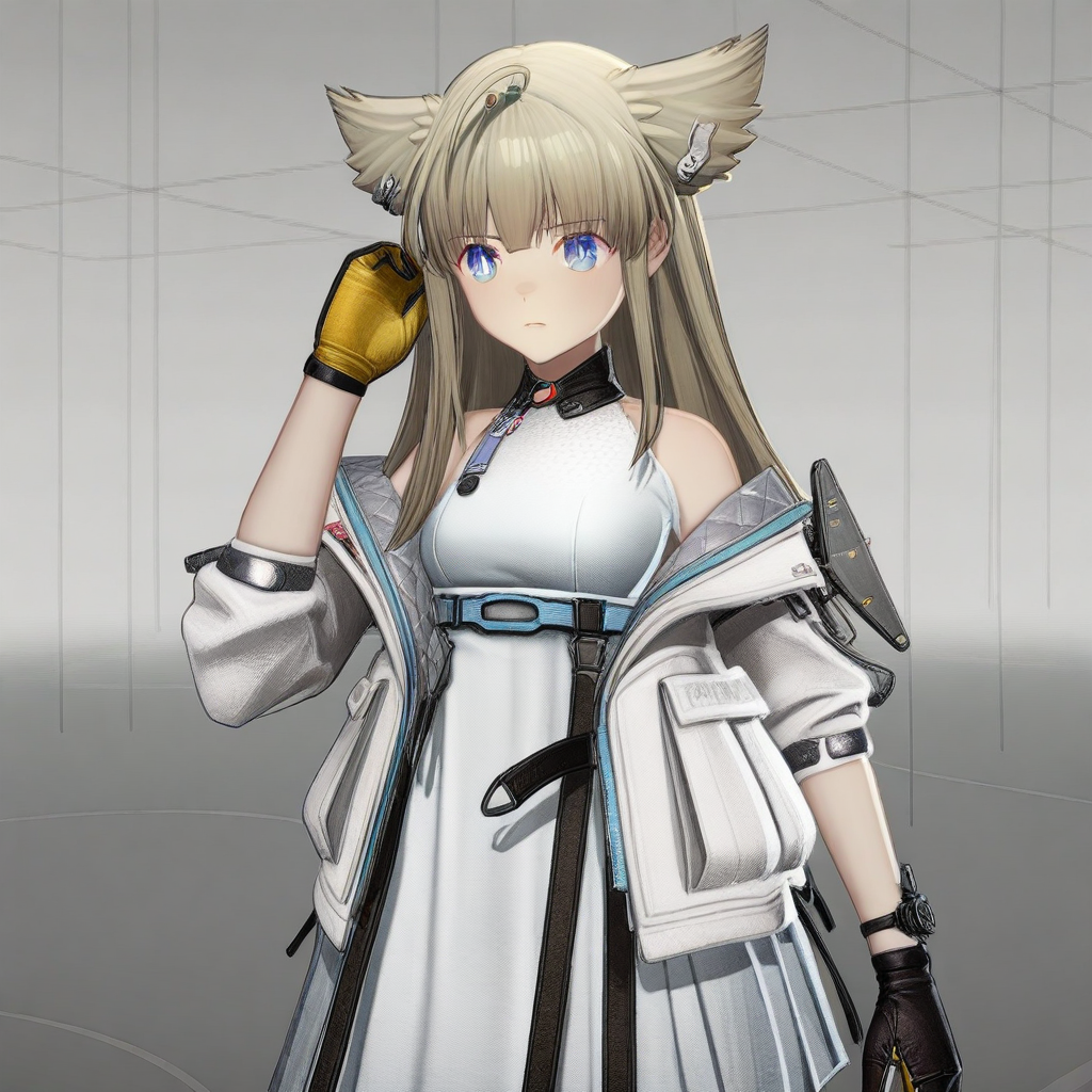 | 训练词汇 | endfield style, 1girl, Perlita, solo, blonde hair, furry ears, ahoge, bangs, sideburns, long hair, blue eyes, white pupils,已复制! white dress, high cyan belt, tassels, black high collar, red and blue collar decorations, white loose jacket, hooded jacket, cyan jacket zipper, free shoulders, short sleeves, brown and yellow gloves, leather gloves, wristband, double circle skirt, thigh strap, pantyhose, ankle radio, black high heels,已复制! |