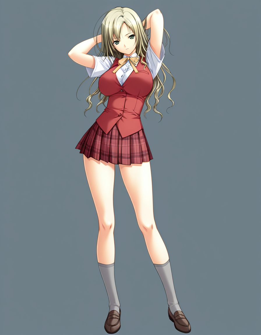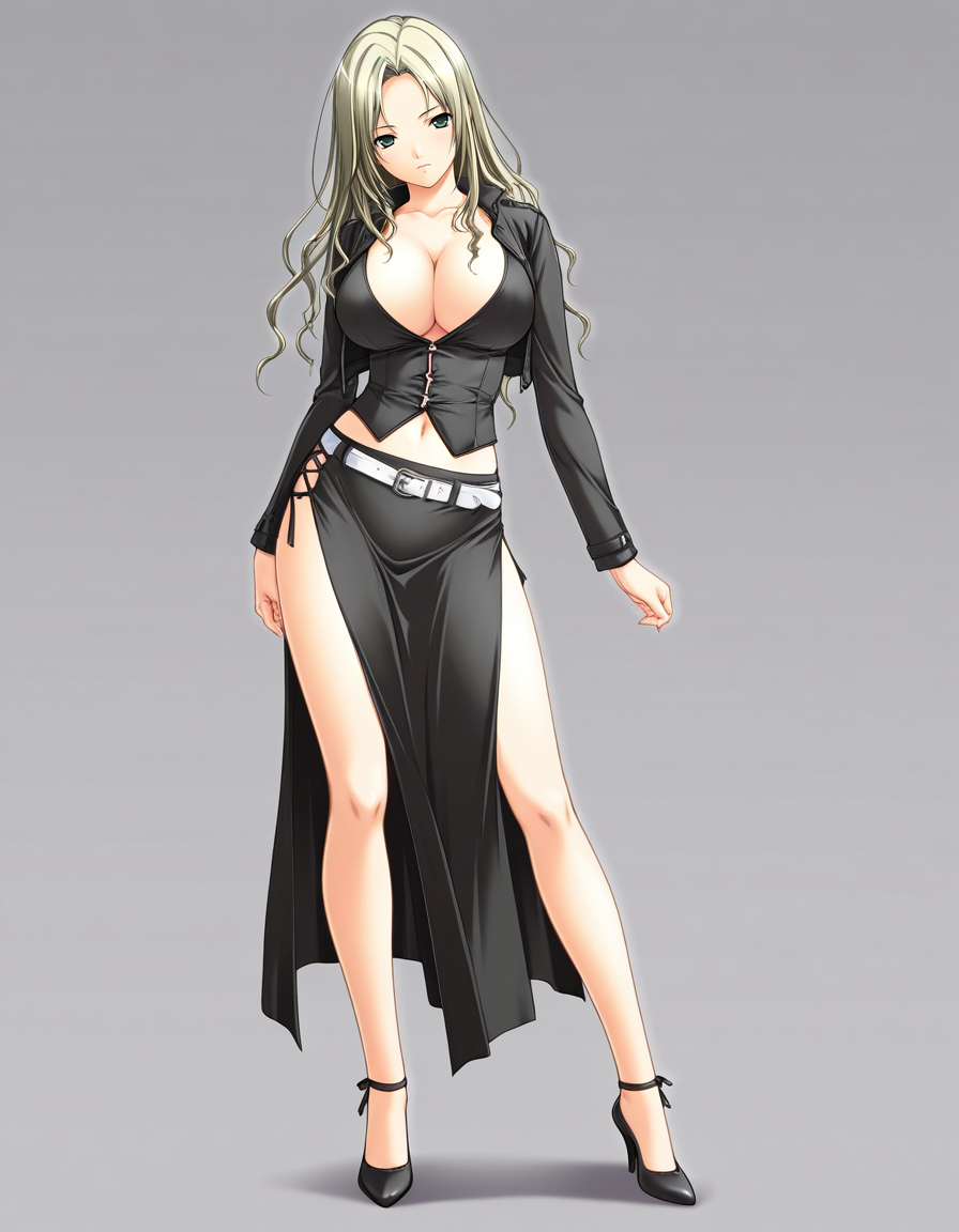 mai_hsg,game_cg,mai_fubukig,long_hair,blonde_hair,green_eyes,large_breasts,black_jacket,belt,long_skirt,black_skirt,side_cutout,high heels,cleavage