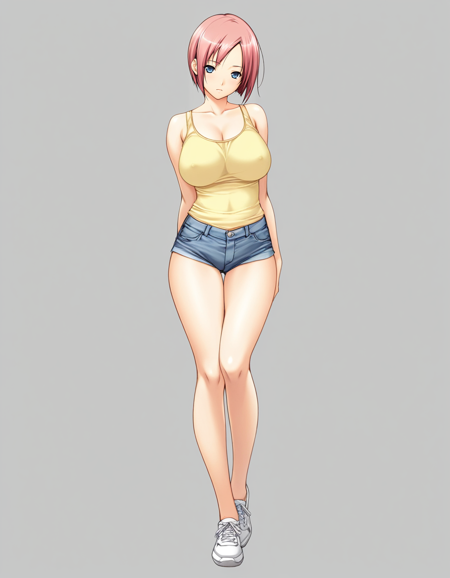 mai_hsg,mai_harukag,game_cg,short_hair,pink_hair,blue_eyes,large_breasts,yellow tank top,denim shorts,sneakers