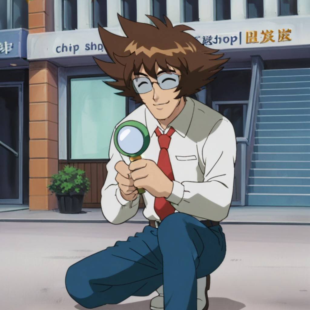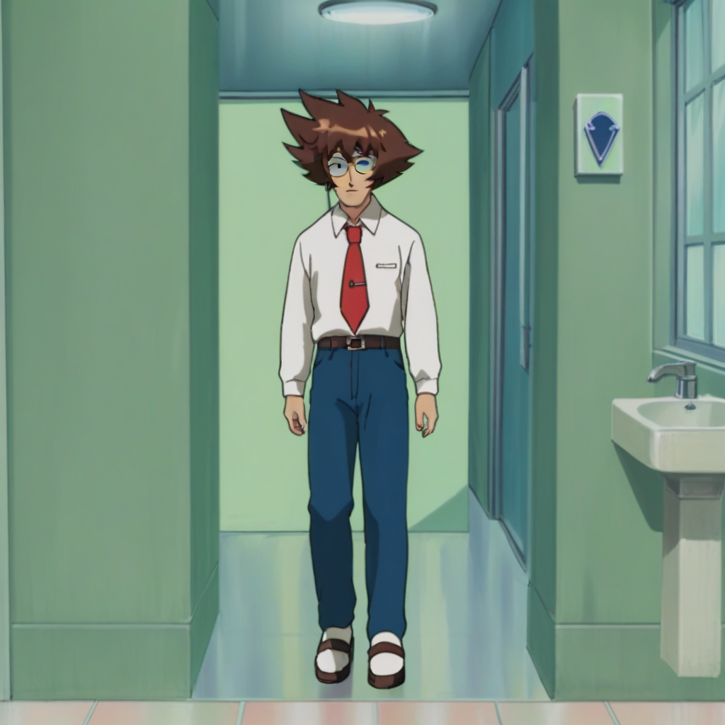 プロンプト:男性、茶色の髪、立ち髪、目を閉じた、眼鏡、白いシャツ、長袖、赤いネクタイ、ベルト、青いズボン、白い靴下、サンダル