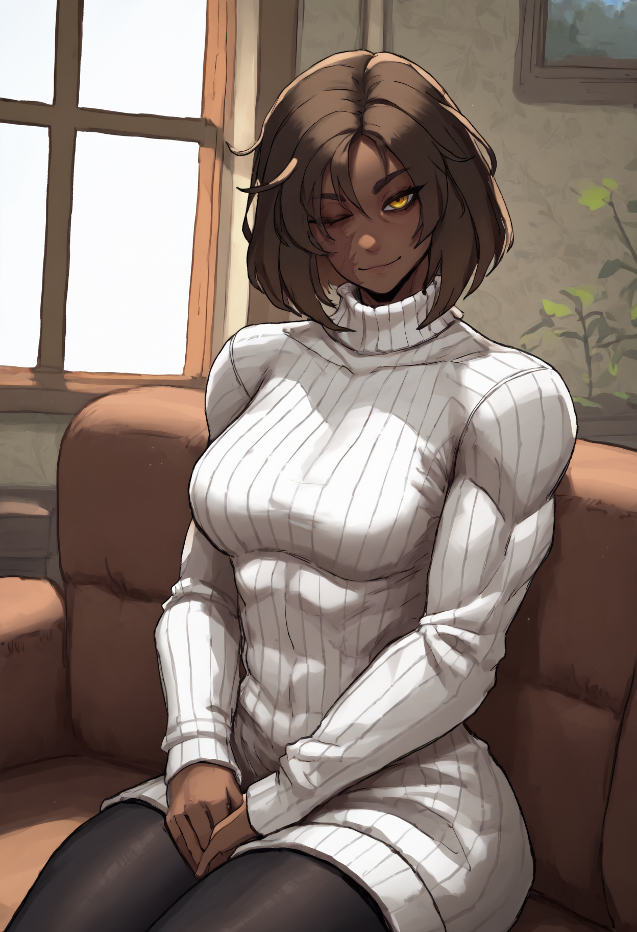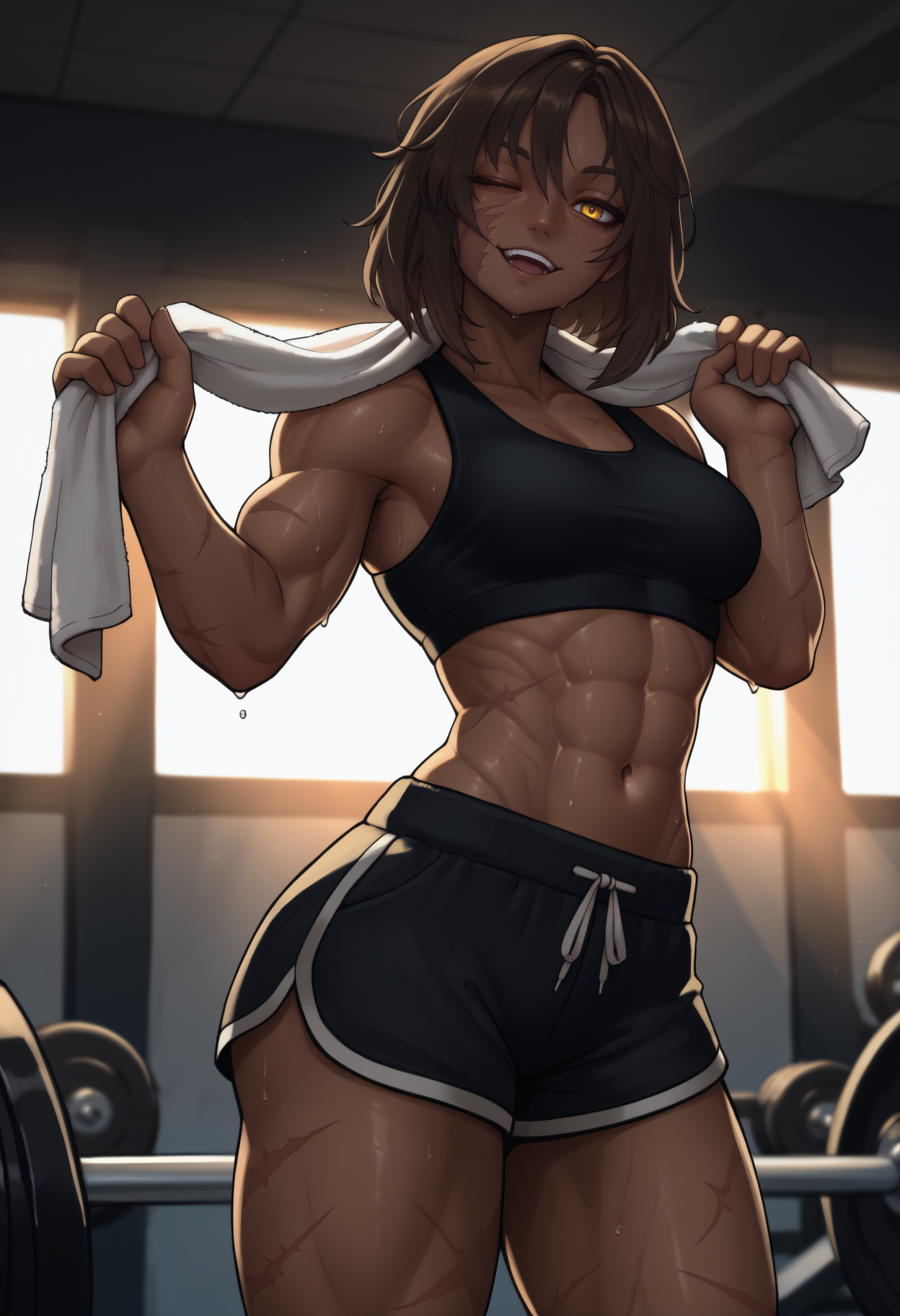 외모: dark-skinned female, muscular female, multiple scars, scar on face, scar on arm, brown hair, yellow eyes, one eye closed