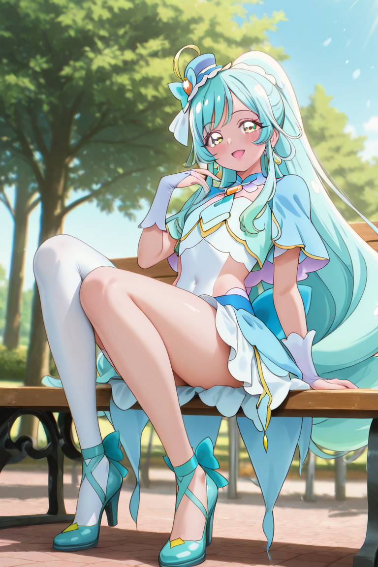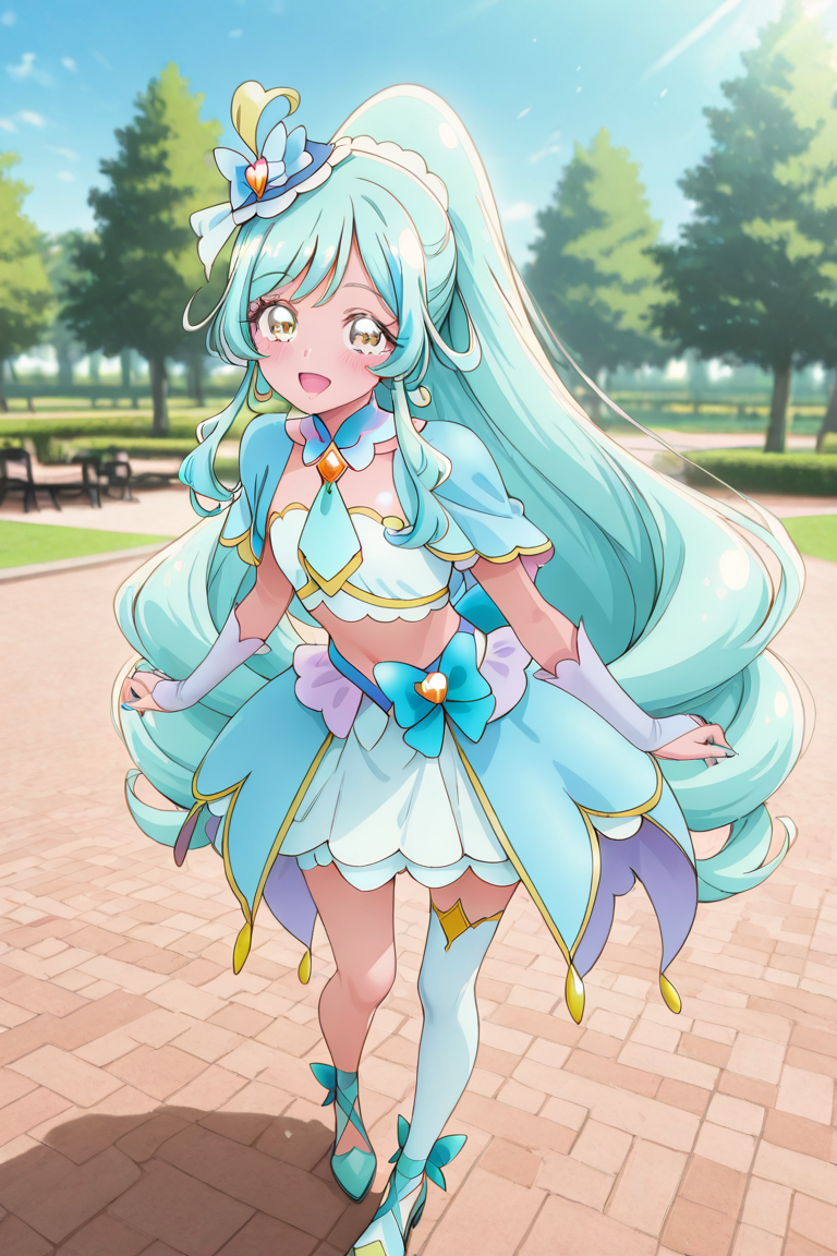 cure_eclair, 1girl, solo, 시청자 보기, 머리 장식, 황금 눈동자, 배꼽 가린, 보석, 매우 긴 머리, 전체 몸, 녹색 머리, 다색 머리, 귀걸이, 넥타이, 줄무늬 머리, 하이힐, 그라데이션 머리, 아쿠아 머리, 뒤쪽 파란 리본, 흰 치마, 마법의 소녀, 립스틱, 흰색 한쪽 허벅지 스타킹, 모자 리본, 파란 머리 장식, 신부 장갑, 파란 손톱, 미니 모자, 팔 보호대, 기울어진 모자, 아쿠아 신발, 발목 리본, 짧은 소매, 옆머리, 흰 장갑, 손가락 없는 장갑, 브로치, 모자 장식, 짧은 셔츠, 파란 카프레트, 넓은 꼬리 머리,