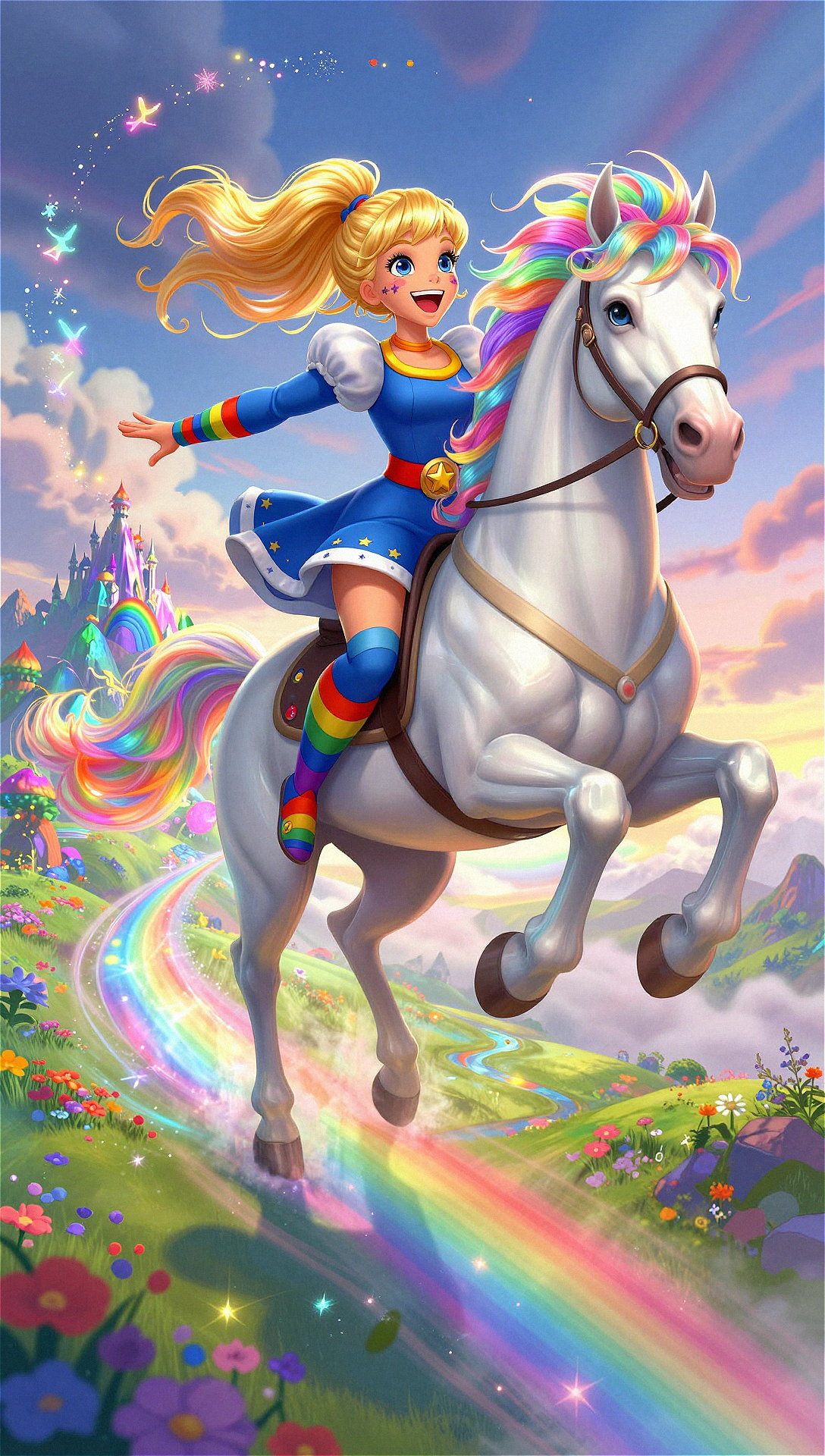 Rainbow Brite wields the power of the Color Belt to generate Star Sprinkles, magical crystals that bring vibrancy and happiness to dull environments. She resides in Rainbow Land, accompanied by her faithful sprite Twink, her talking horse Starlite—described as the most magnificent horse in the universe—and the seven Color Kids, each managing a specific color with the assistance of sprites who mine color crystals. Her primary adversaries include Murky Dismal and his sidekick Lurky, who perpetually scheme to eliminate color and impose gloom, highlighting Rainbow Brite's role as a steadfast guardian of joy and optimism.