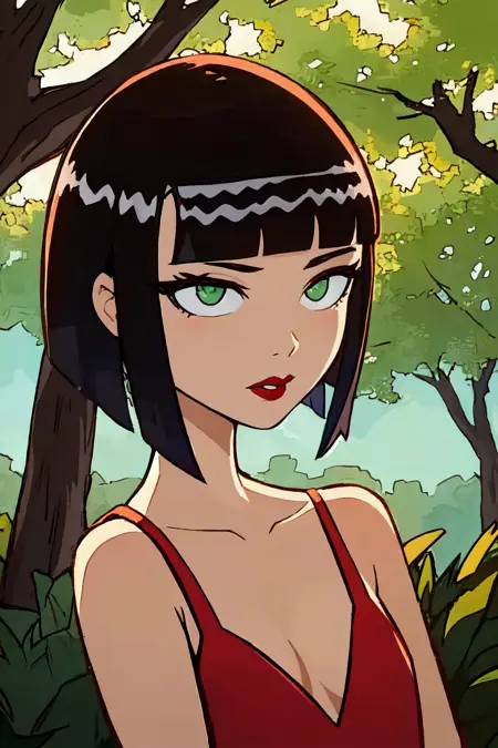 프롬프트는 인그리드, 녹색 눈, 립스틱, 붉은 입술, 검은 머리, 정렬된 앞머리, 밥컷