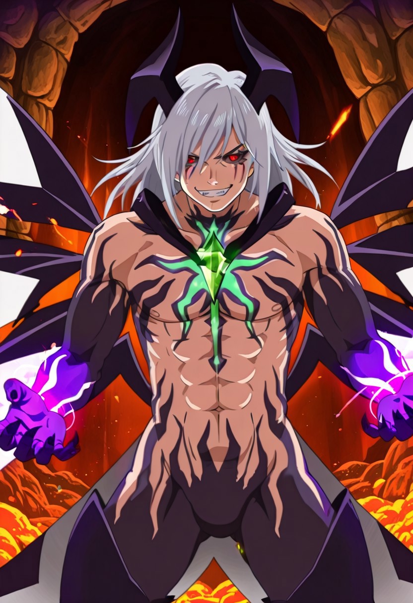 | トレーニングワード | Richard Lambda, long gray-silver hair, black-purple horns, dark gray sclera, red eyes, slit pupils, black-purple facial marks, naked, black-purple body tattoo marks, convenient censoring, green chest gem, purple wrist gems, sharp talons, black-purple thigh boots, long back split tailcoat, detached wingsコピーしました! |