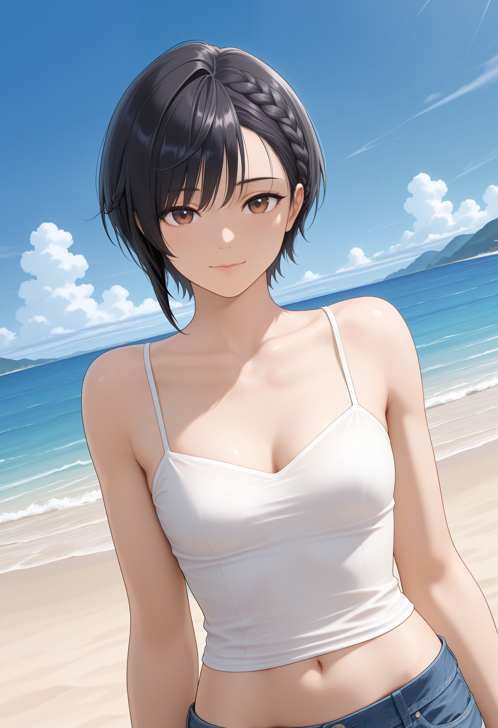 - ハーフクラウン編み込み:「brown eyes,black hair,short hair,braid,asymmetrical hair,small breasts,aged up」