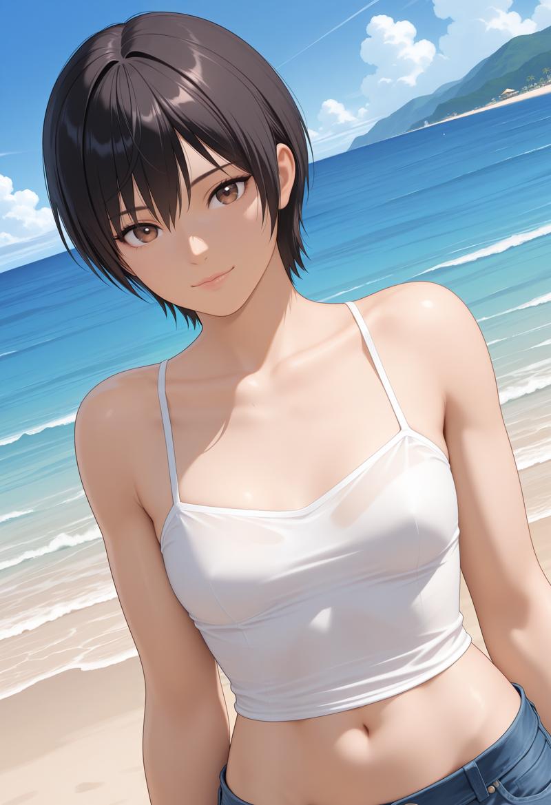 - ショートヘア:「brown eyes,black hair,short hair,small breasts,aged up」