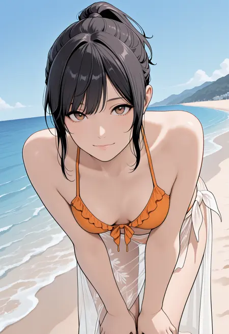 - ショートポニーテール:「brown eyes,black hair,short ponytail,sidelocks,small breasts,aged up」