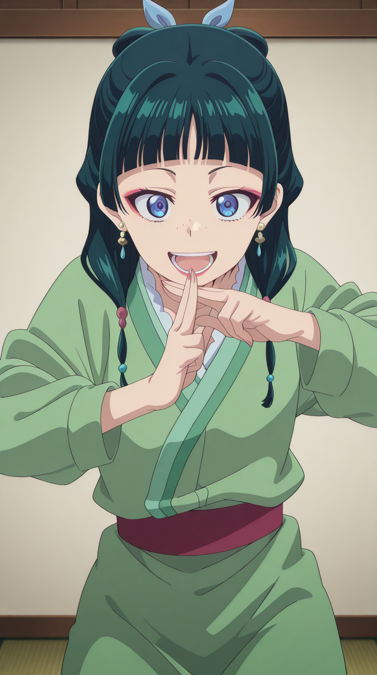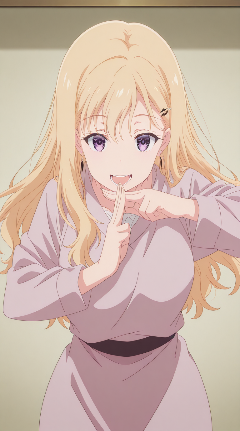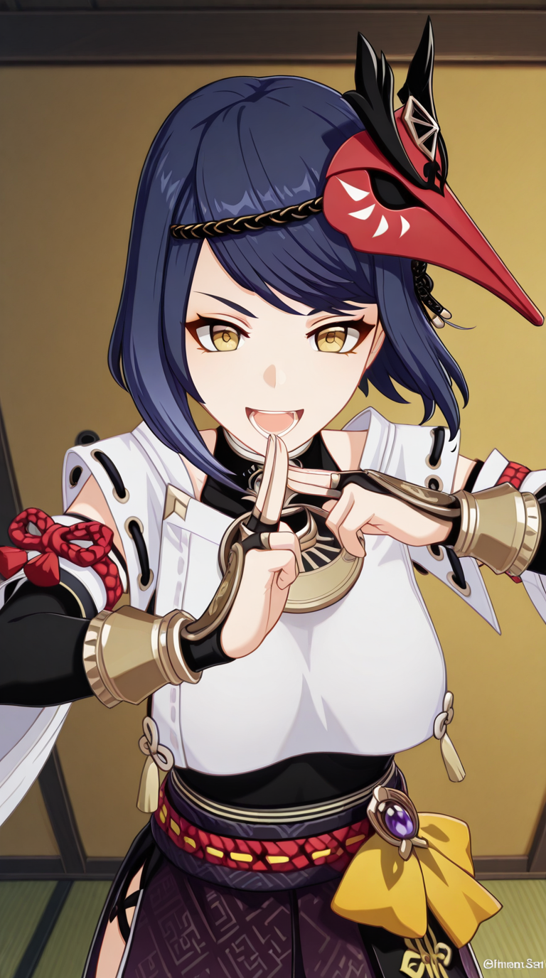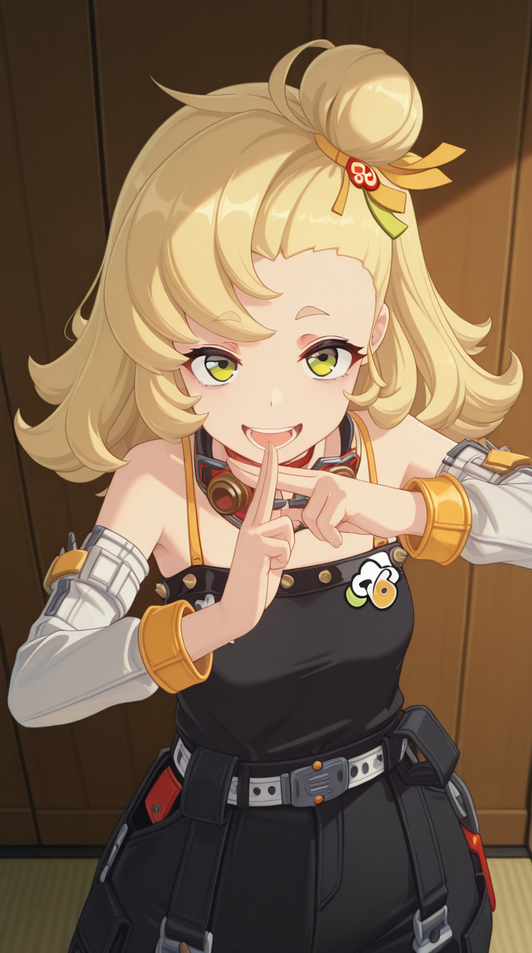 lora:kuji-in-illustriousxl-lora-nochekaiser:1, kuji-in, 혼자, 시청자 바라보기, 미소, 벌어진 입, 이빨, 손을 들고,