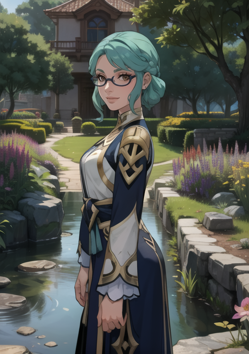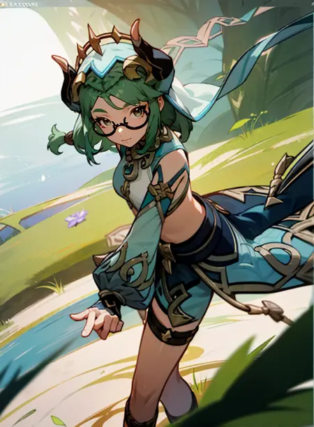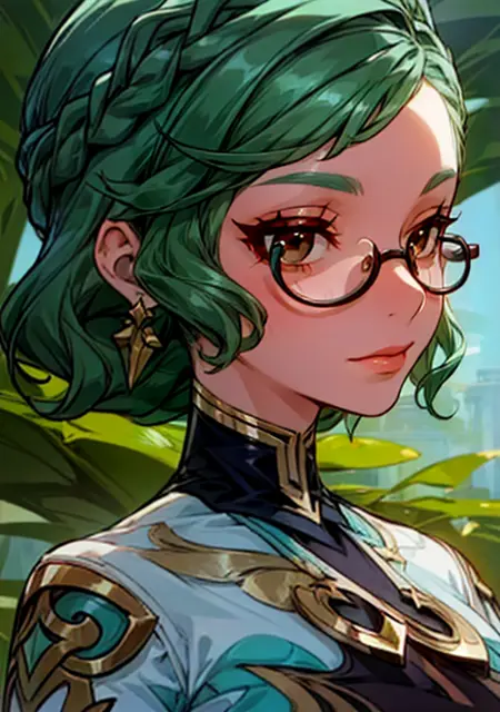(masterpiece, best quality),(depth) of (field), lora:Haypasia\_2:0.8 haypasia_(genshin_impact), short_hair, gold_ornaments, glasses, green_hair, brown_eyes, semi-rimless_eyewear, wavy_hair, white and blue clothes, braid, aqua_hair, adult