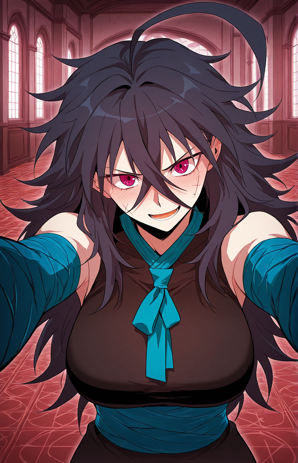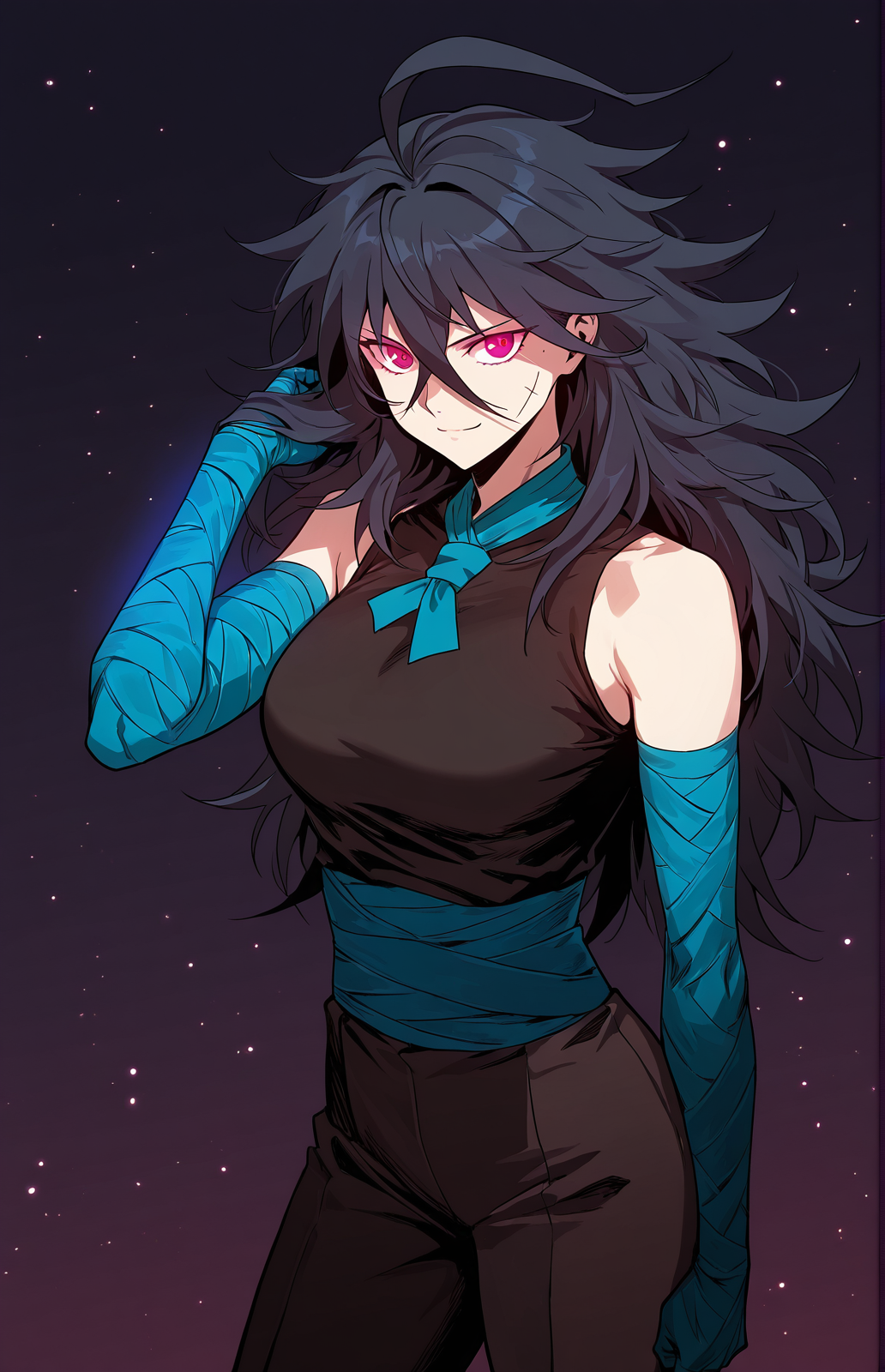 Sora, 1girl, solo, magenta eyes, dark blue hair, long hair, wild hair, spiky hair, messy hair, long bangs, uneven bangs, hair between eyes, sidelocks, loose hair, ahoge, cheek scar,