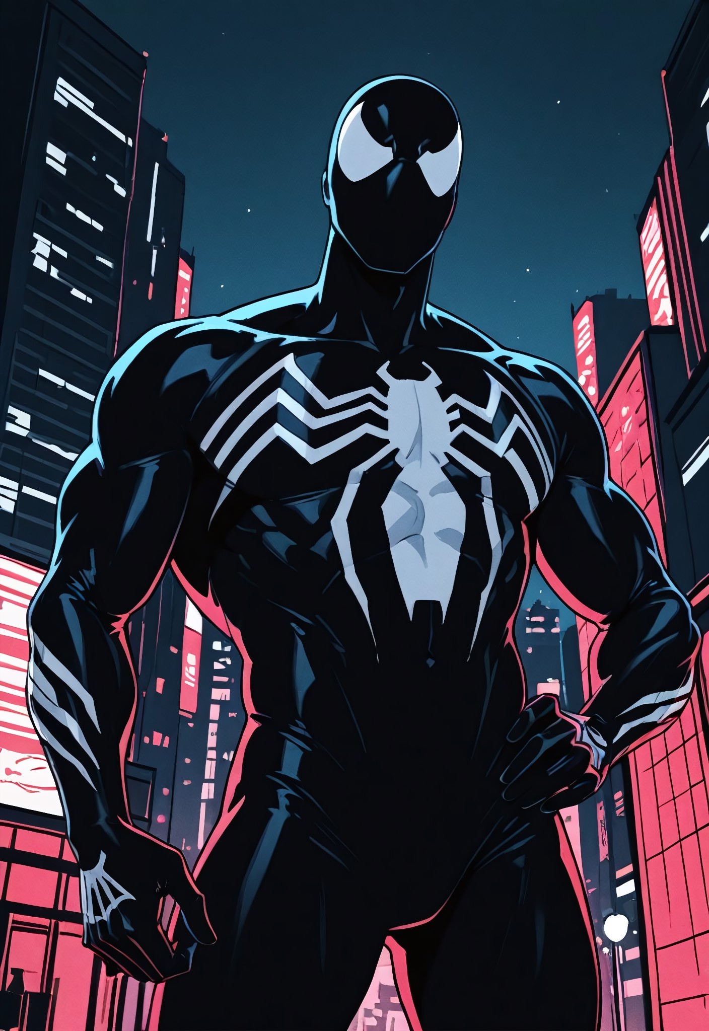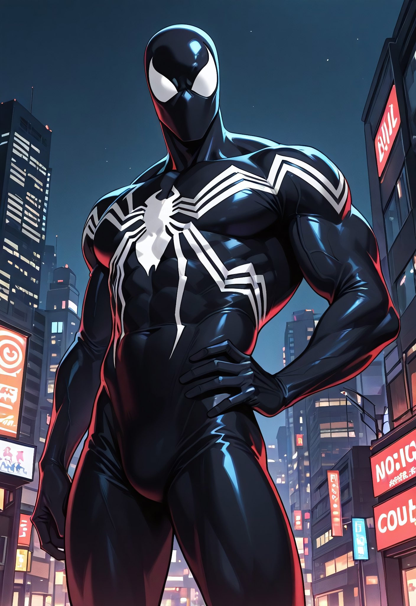 spiderman1963_(amazing)comicsXL, symbiote, body suit, black suit, spider print, 1boy, solo, mask, muscular,