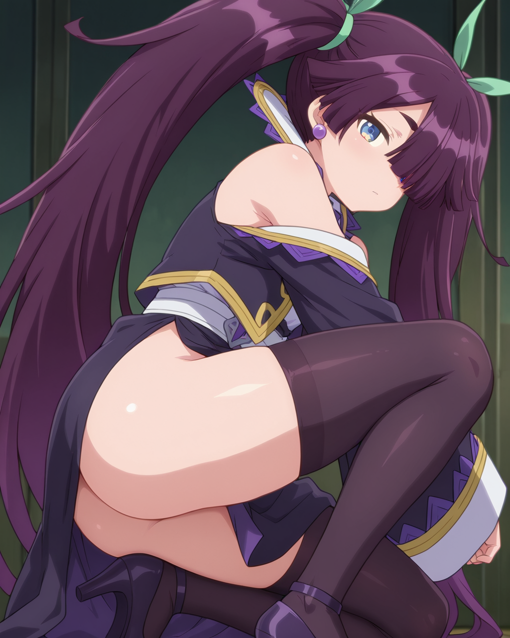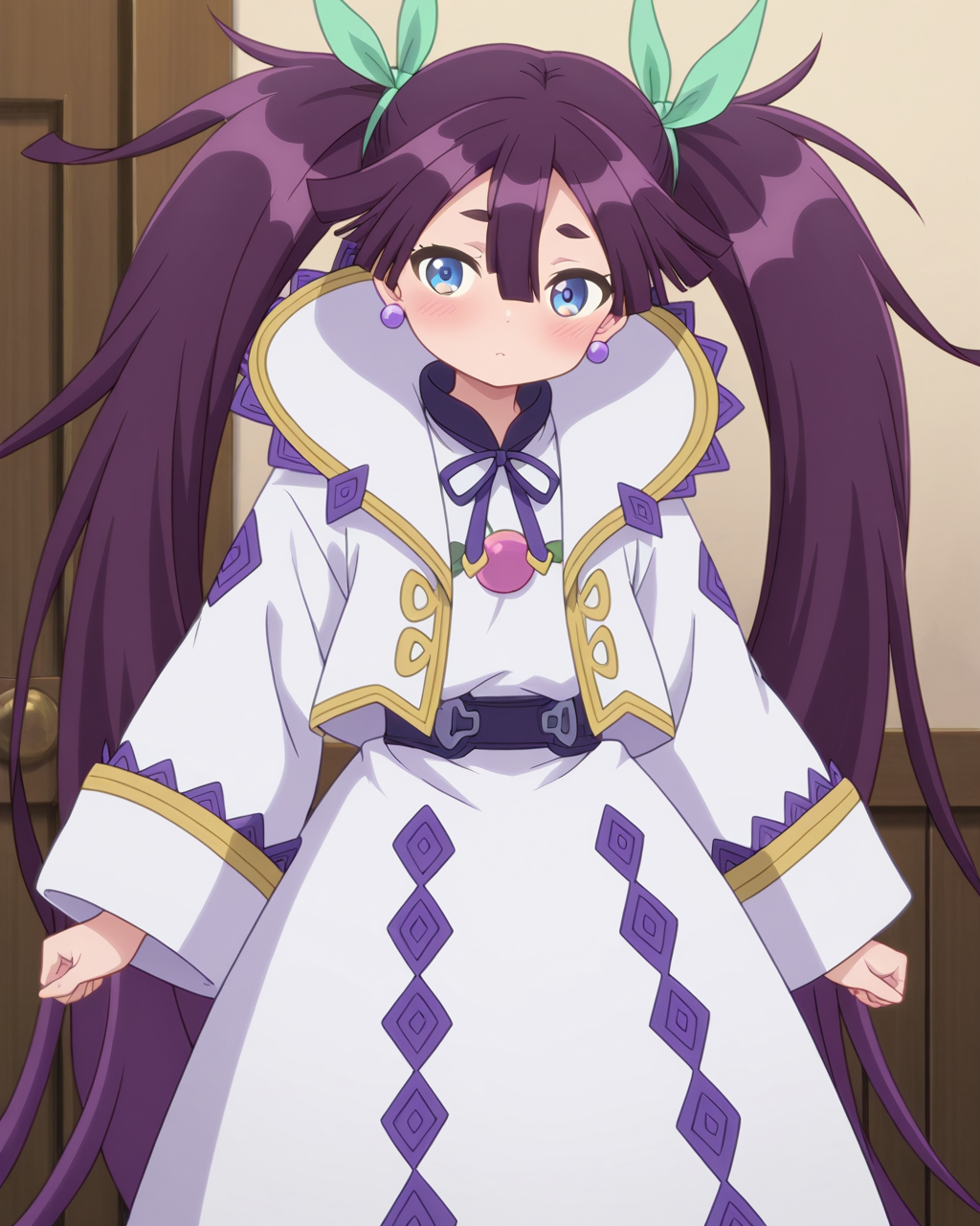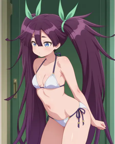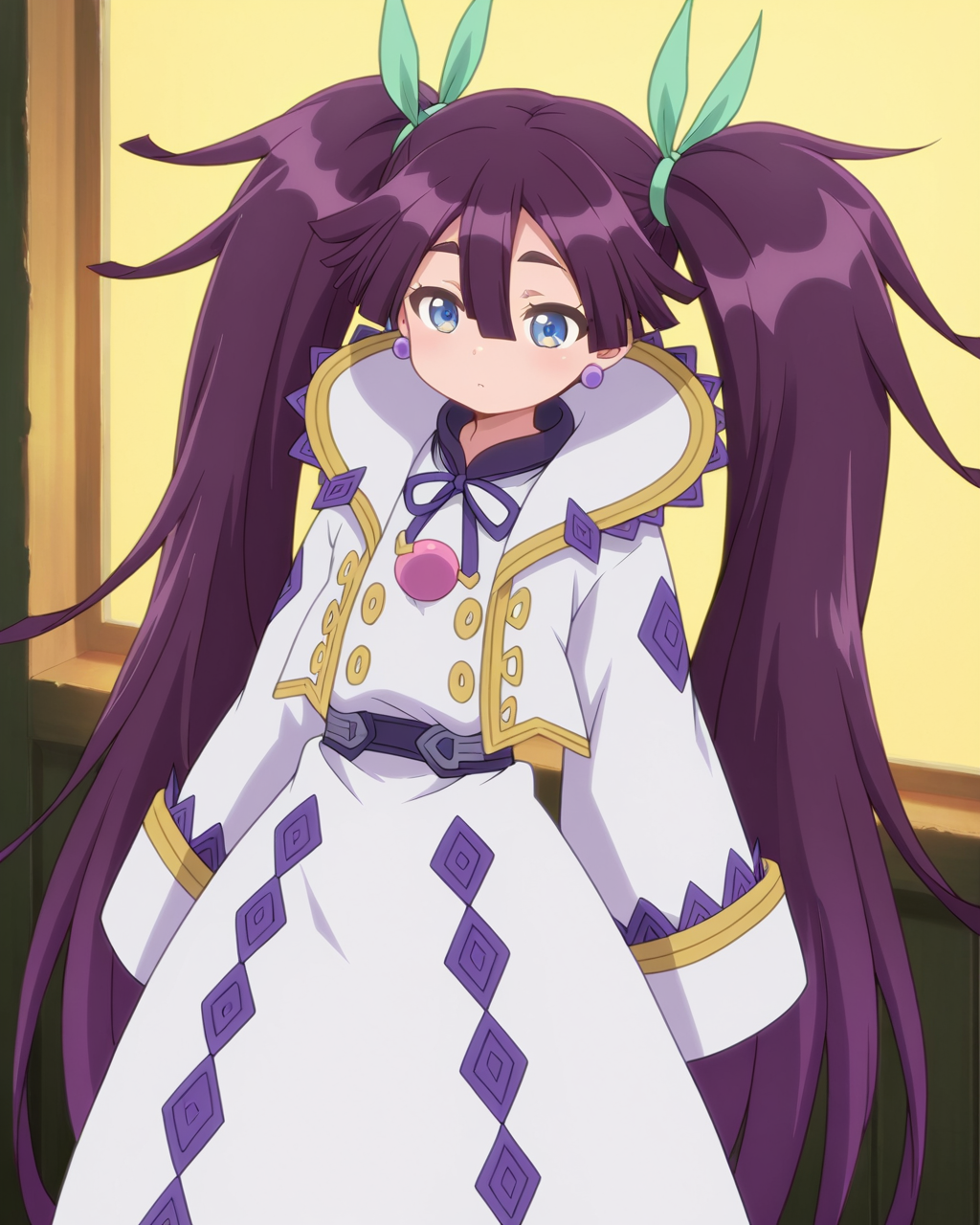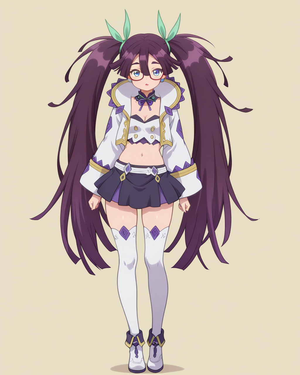 Alka, dark purple hair, blue eyes, long hair, very long hair, hair between eyes, twintails, hair ribbon, green ribbon, flat-breasted, 1girl, solo, dynnamic pose