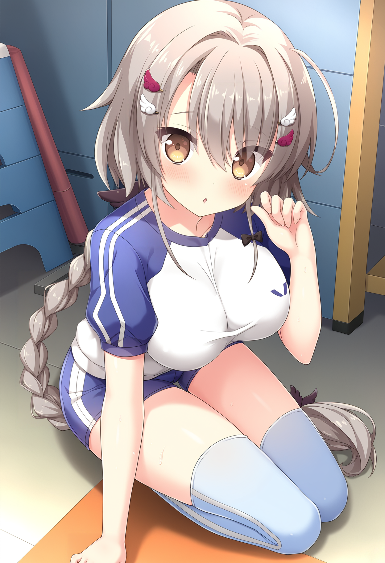 gym uniform,ame,1girl,solo,brown eyes,medium hair,single braid,low-tied long hair,low-braided long hair,braid,hair black bow,wing pink hairclip,wing white hairclip,wing hair black ornament,white gym shirt,blue short sleeves,blue gym shorts,light blue thighhighs,