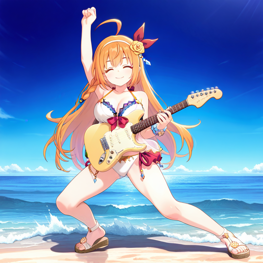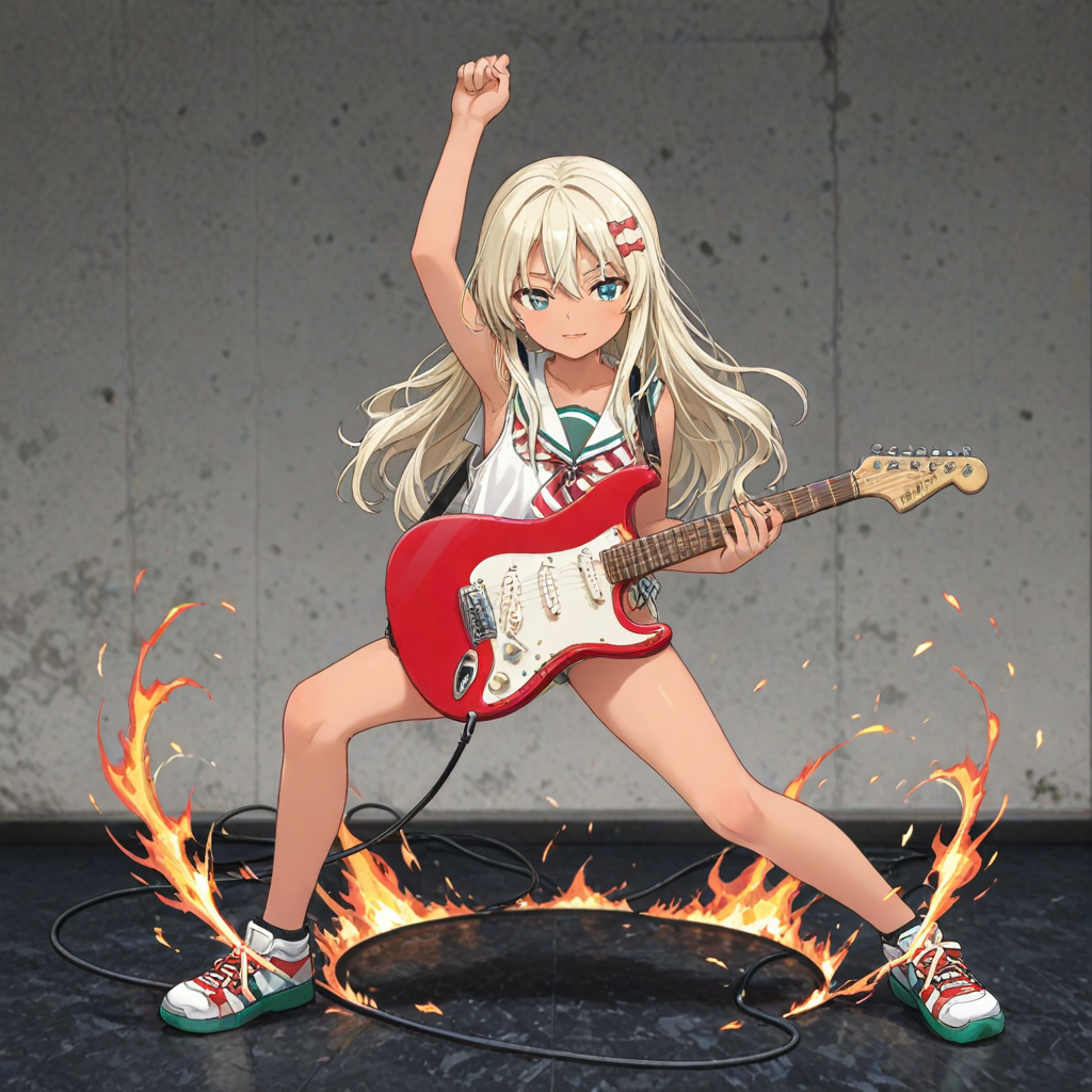low_stance_raiseR,1girl, full body,dynamic pose, wide stance, low stance, one knee down,right arm raised, arm above head, asymmetrical pose,battle stance,holding object,electric guitar,