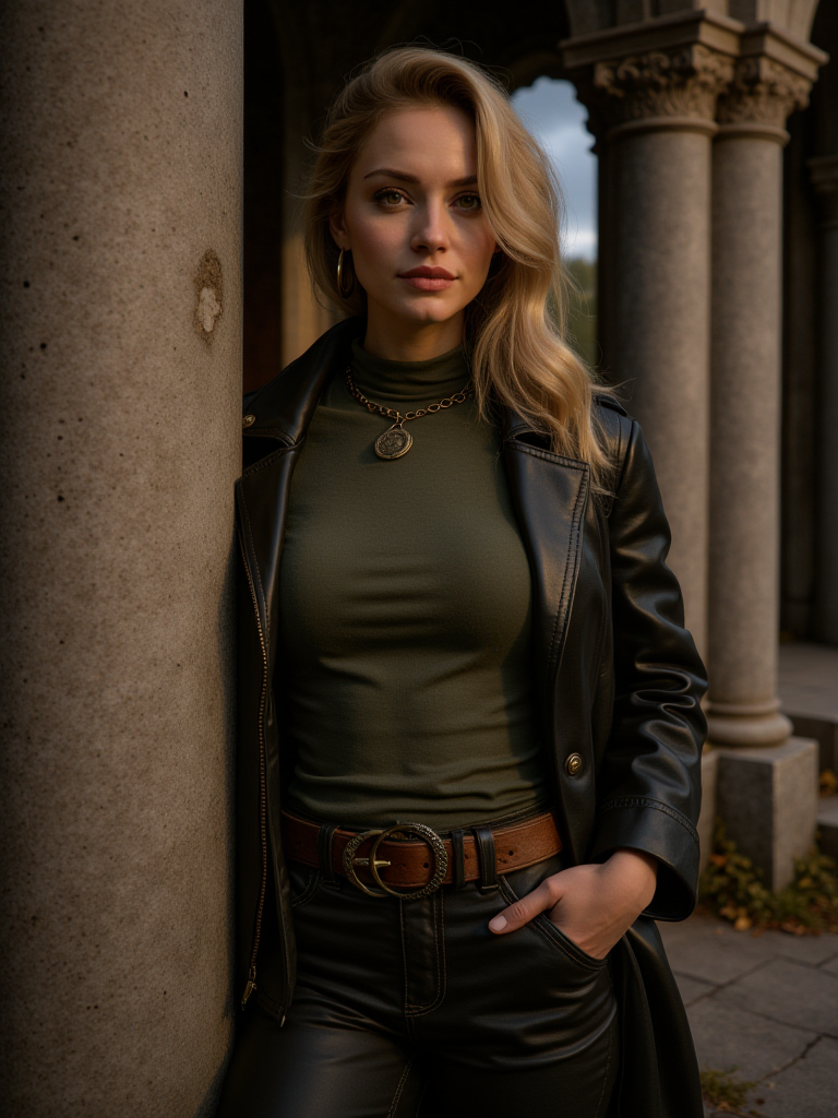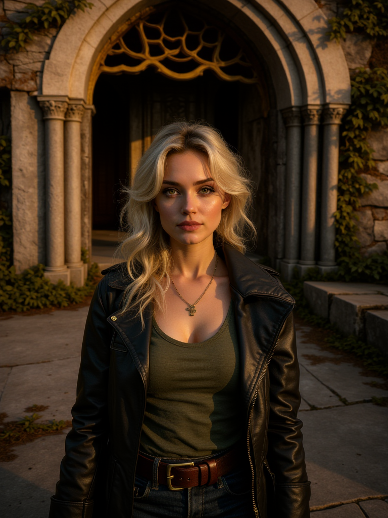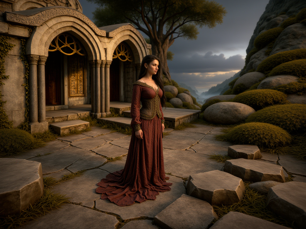 神秘的でファンタジーな風景。現実的で、まるで超自然的なスタイルで描かれており、古代の神秘と圧倒的な自然の壮大さを感じさせる。全体のトーンは内省的で静謐だが、暗く重い空にドラマチックな緊張感がにじむ。古代の石造りの構造物、おそらく神殿や修道院の複合施設が、岩場の断崖に沿って伸びており、装飾的なアーチと風雨にさらされた柱が、荒々しい地形と見事に溶け込んでいる。何世紀にもわたって磨かれた石の階段が構造物へと上り、断崖の曲がり角を越えて消えていく。根がねじれた大きな木が岩にしがみつき、濃く鮮やかな緑の葉が自然の天蓋を形成している。すぐ前の風景の先には、広大な山脈が広がり、谷間にたまり、峰々を這うように漂う大気の霧に包まれている。これらの山々は鋭く威圧的で、ドラマチックな雲に覆われた空の下、遠くまで続いており、その雲の間から光のヒントが差し込んでいる。風景は多様な植生に富み、主に常緑樹が岩の露出部に点在している。石造りの構造物は左側にしっかりと位置し、そのアーチは広大な眺めに向かって開かれている。曲がりくねった階段は構造物へと上り、視線を古代の建築へと誘う。山脈は背景を支配し、霧に包まれた谷がそびえる峰々の間に沈んでいる。断崖と谷の植生は、荒々しい石と遠くの険しい山々との対比として、豊かな緑を提供している。