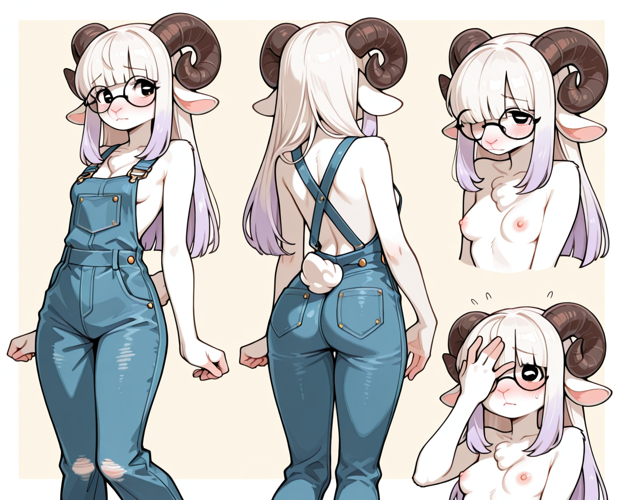 anthropomorphic sheep girl, long slim build, pastel purple dyed tips, small rounding horns, round thin framed glasses, long straight hair, loose face-framing strands,