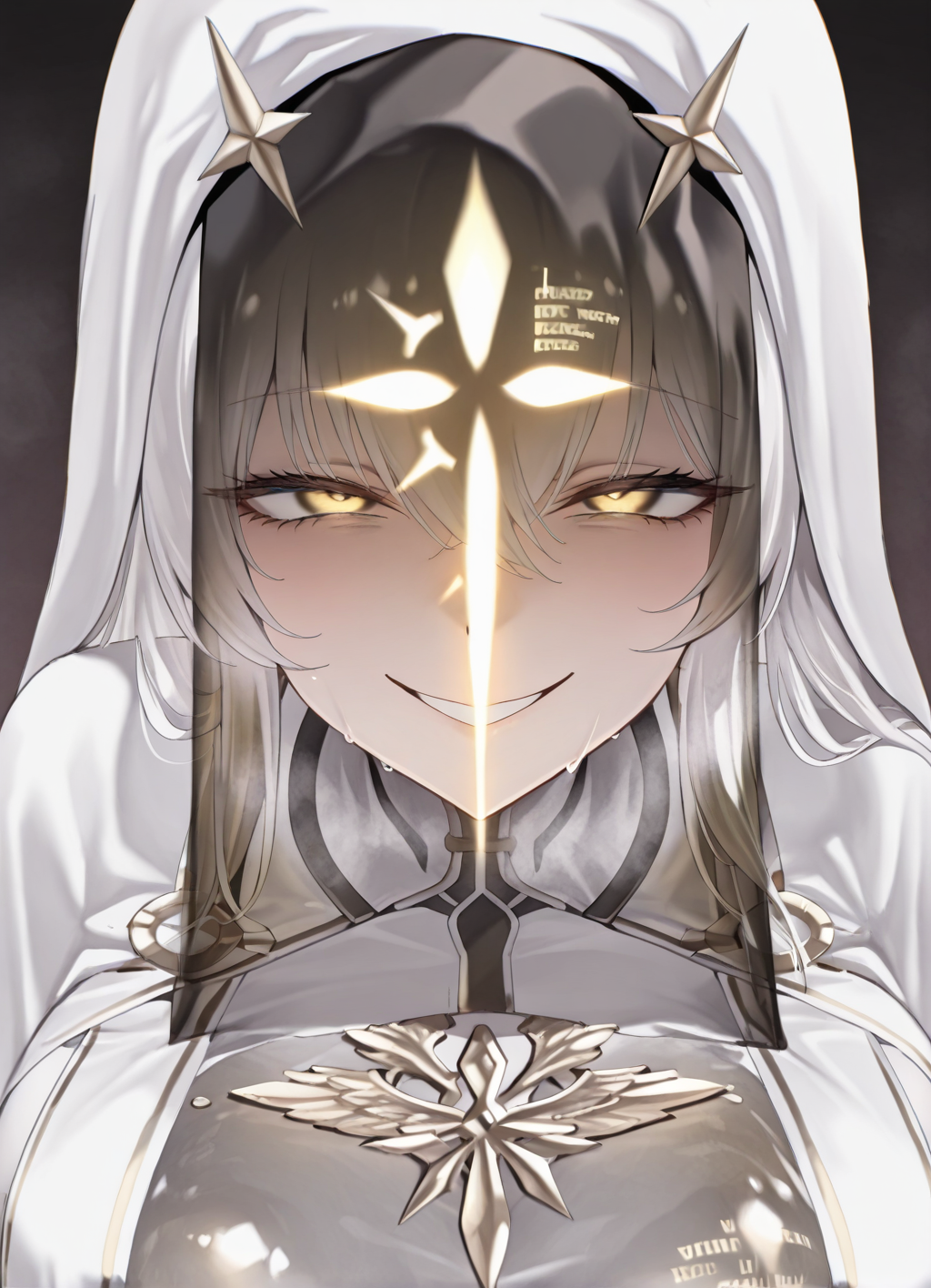 | トレーニングワード | VTC_priestess_nikke, long white hair, nun, white hood, veil, glowing cross, gold trim, covered face, white dress, long dress, tight dress, cleavage, large breasts, revealing clothing, long sleeves, white gloves, black bodysuit, bodysuit under clothes,コピーしました! |