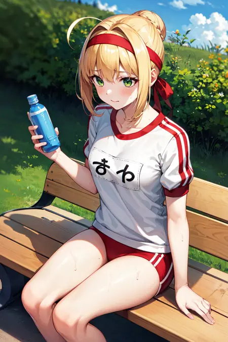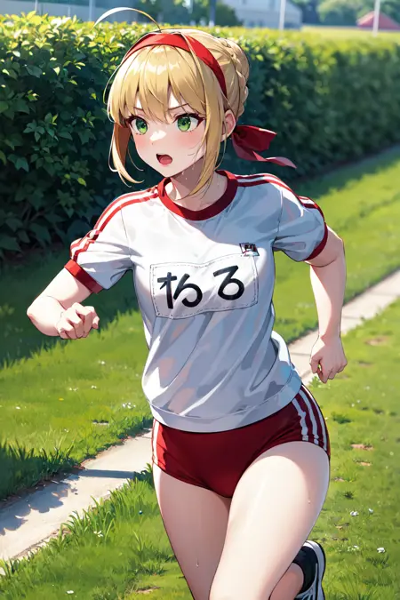 服装6aanero, ahoge, 辫子, 单发髻, 红色发带, 绿眼睛, 中等胸部, 锁骨, 体操服, 白色衬衫, 短袖, 姓名牌, (红色内裤:1.2), 裸腿