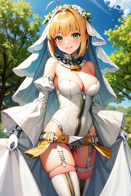 服装3aanero, ahoge, 花环, 婚纱面纱, 绿眼睛, 分离式衣领, 链条, 挂锁, 露肩, 无吊带, 白色紧身衣, 白色连衣裙, 拉链, 分离式袖子, 白色手套, 白色腰带, 吊袜带, 白色过膝袜, 吊袜带