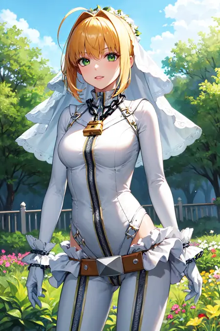 服装2aanero, ahoge, 面纱, 绿眼睛, 链条, 挂锁, (白色紧身衣:1.2), 拉链, 白色手套, 腰带, 花边, 白色连衣裙