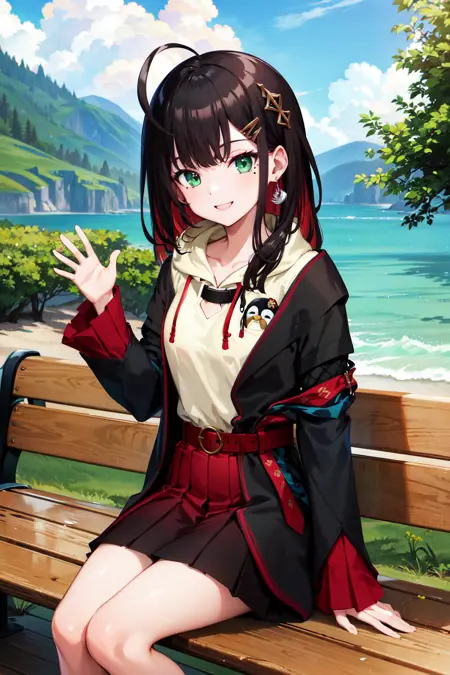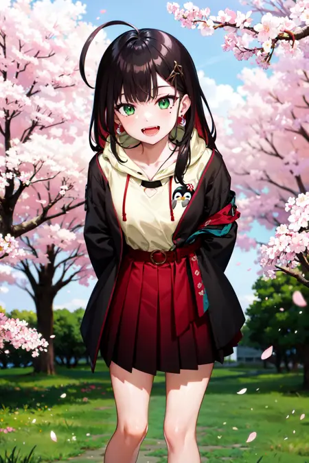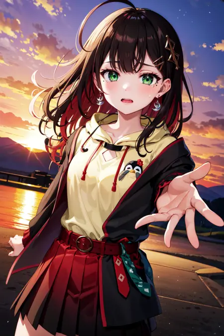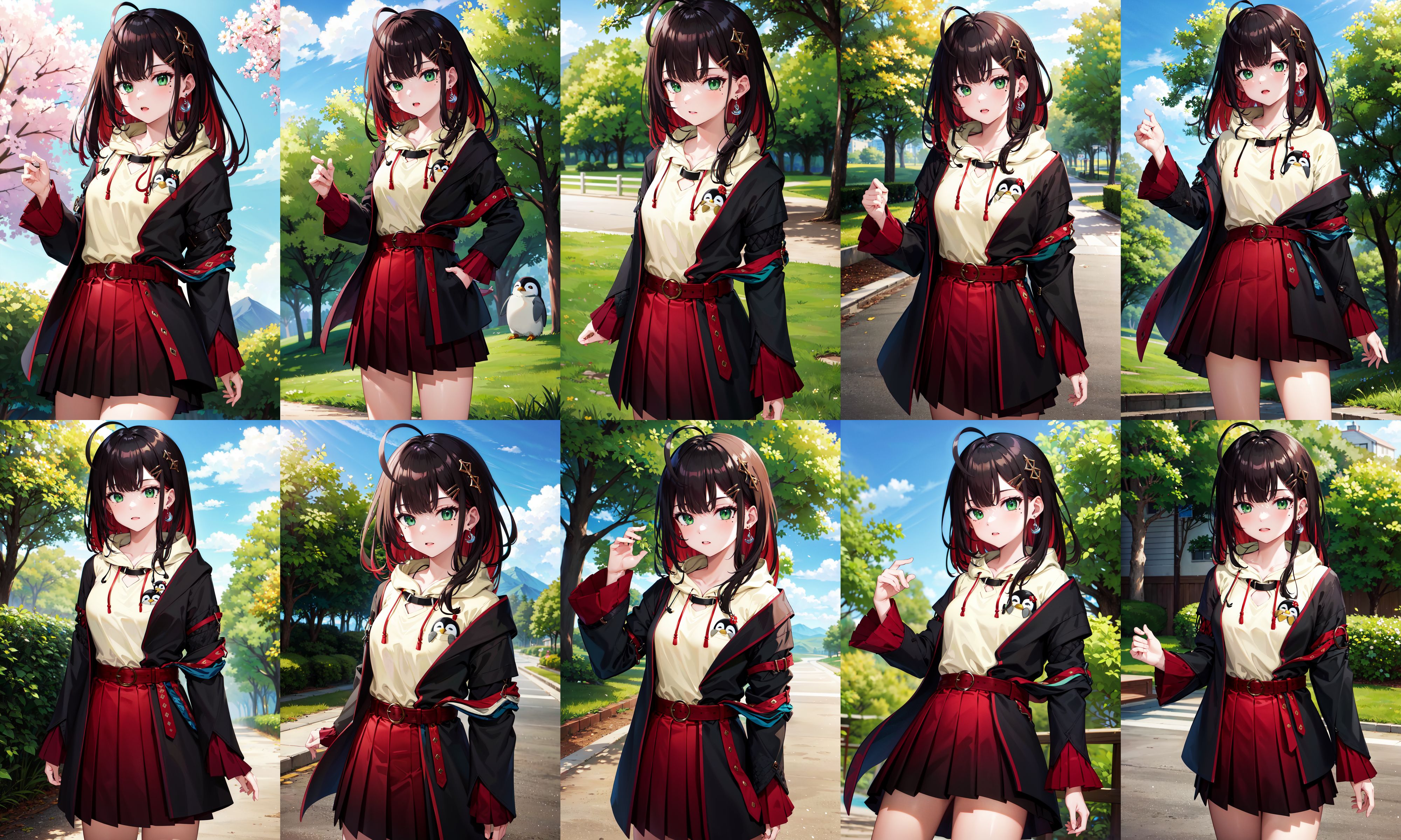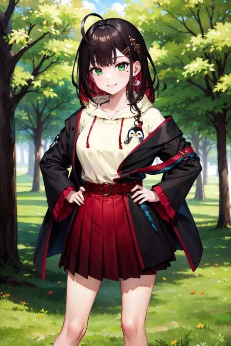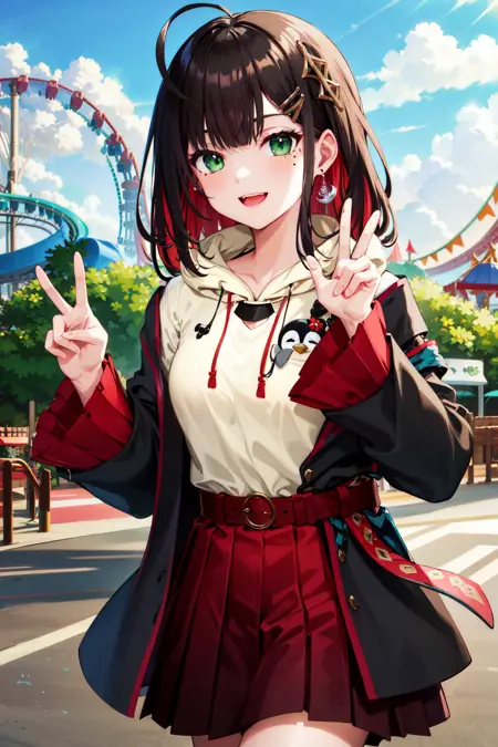 衣装1aayui、ミディアムヘア、複色の髪、アホ毛、緑の目、目の下のほくろ、イヤリング、シャツ、白いフーディー、ペンギン、フード、黒いジャケット、開いた服、長袖、ベルト、赤いスカート、プリーツスカート