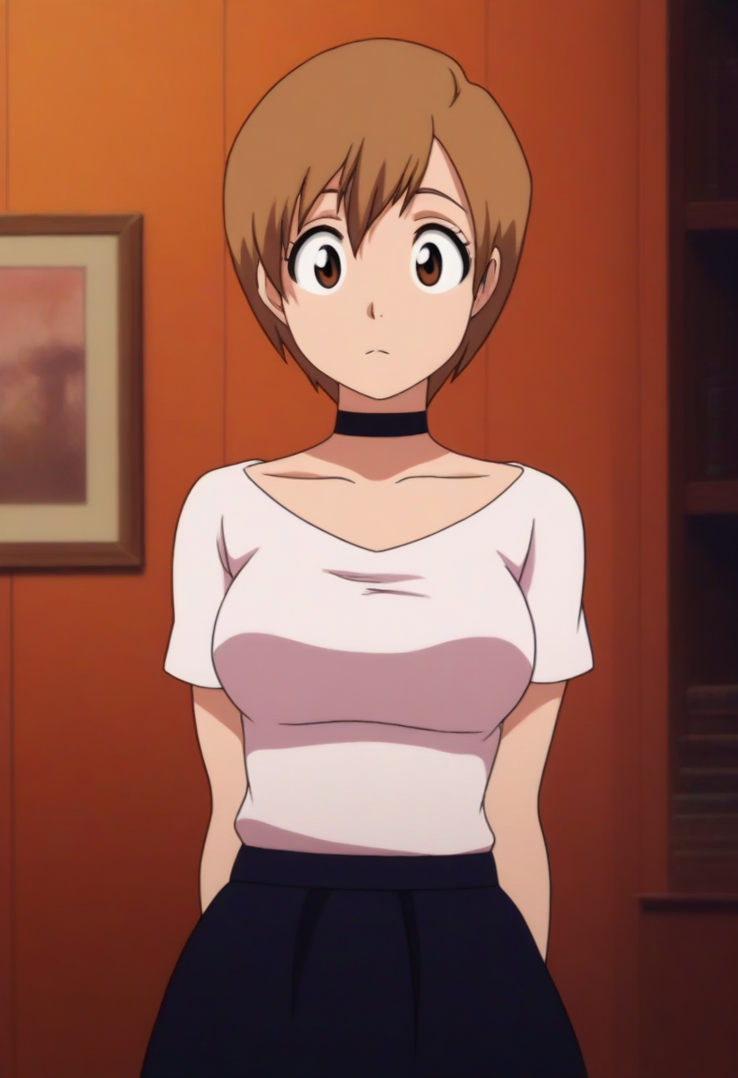 갈색 머리, 단발, 갈색 눈, 셔츠, 치마, 초커,