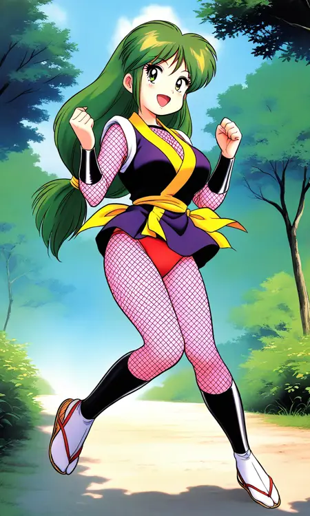 짧은 키모노, 노란 띠, 닌자, 일본 전통복, 네트 바디슈트, 빨간 팬티,