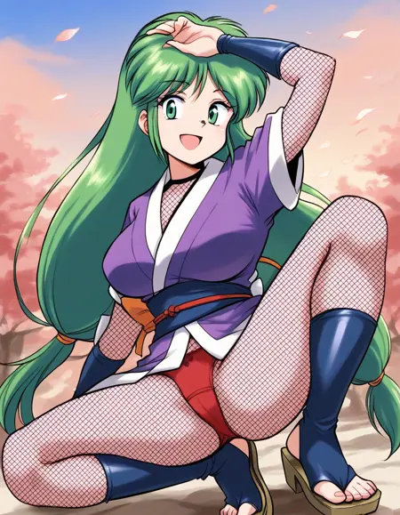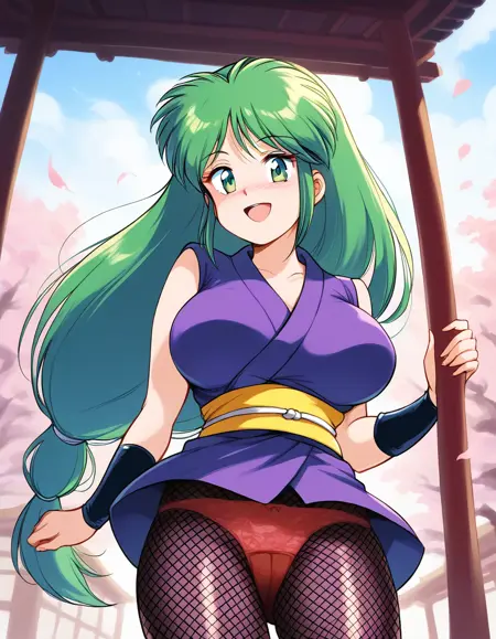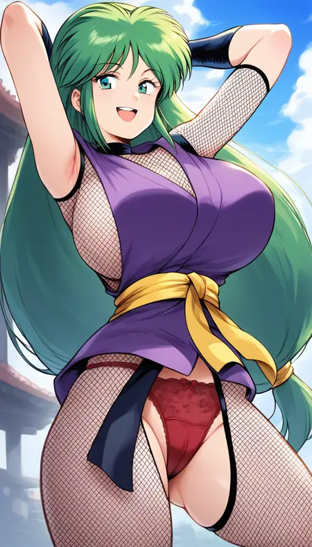 짧은 키모노, 노란 띠, 닌자, 일본 전통복, 네트 바디슈트, 빨간 팬티,