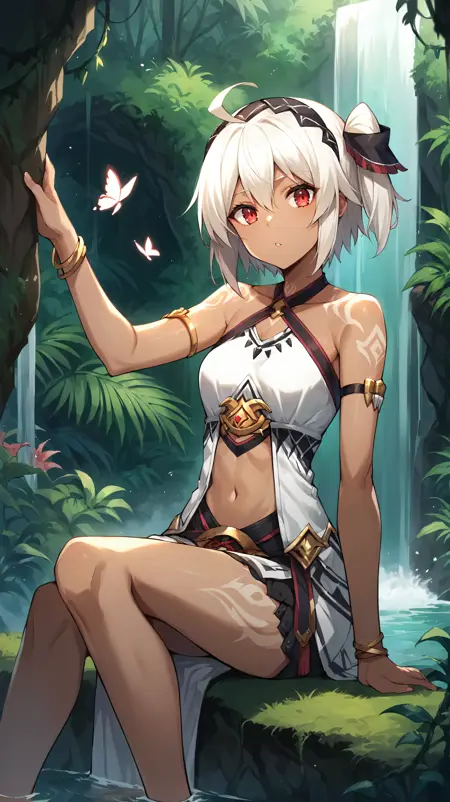 dark skin, white tattoo, white dress, gold trim, halterneck, navel, bare shoulders, short white hair, side ponytail, red eyes, ahoge, headdress, bracelet, armlet
