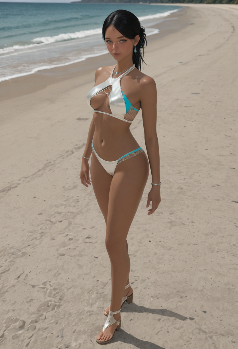 タグ:黒髪、グレーの目、ビキニ、濃い肌、ハーネック、頬の赤み、服のカットアウト、青白いビキニ、裸の肩、イヤリング、ネックレス、ブレスレット、中程度の胸