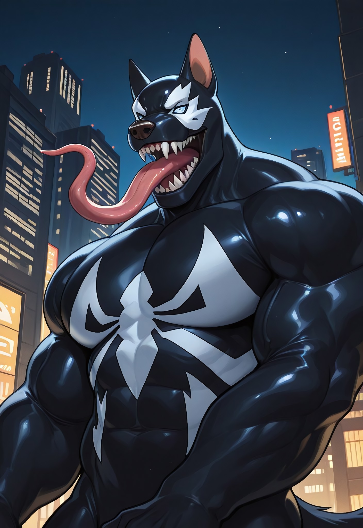 venomangelo_(marvelknights)XL, symbiote, body suit, black suit, spider print, 1boy, solo, monsterboy, muscular, mouth, sharp teeth, long tongue, claws,