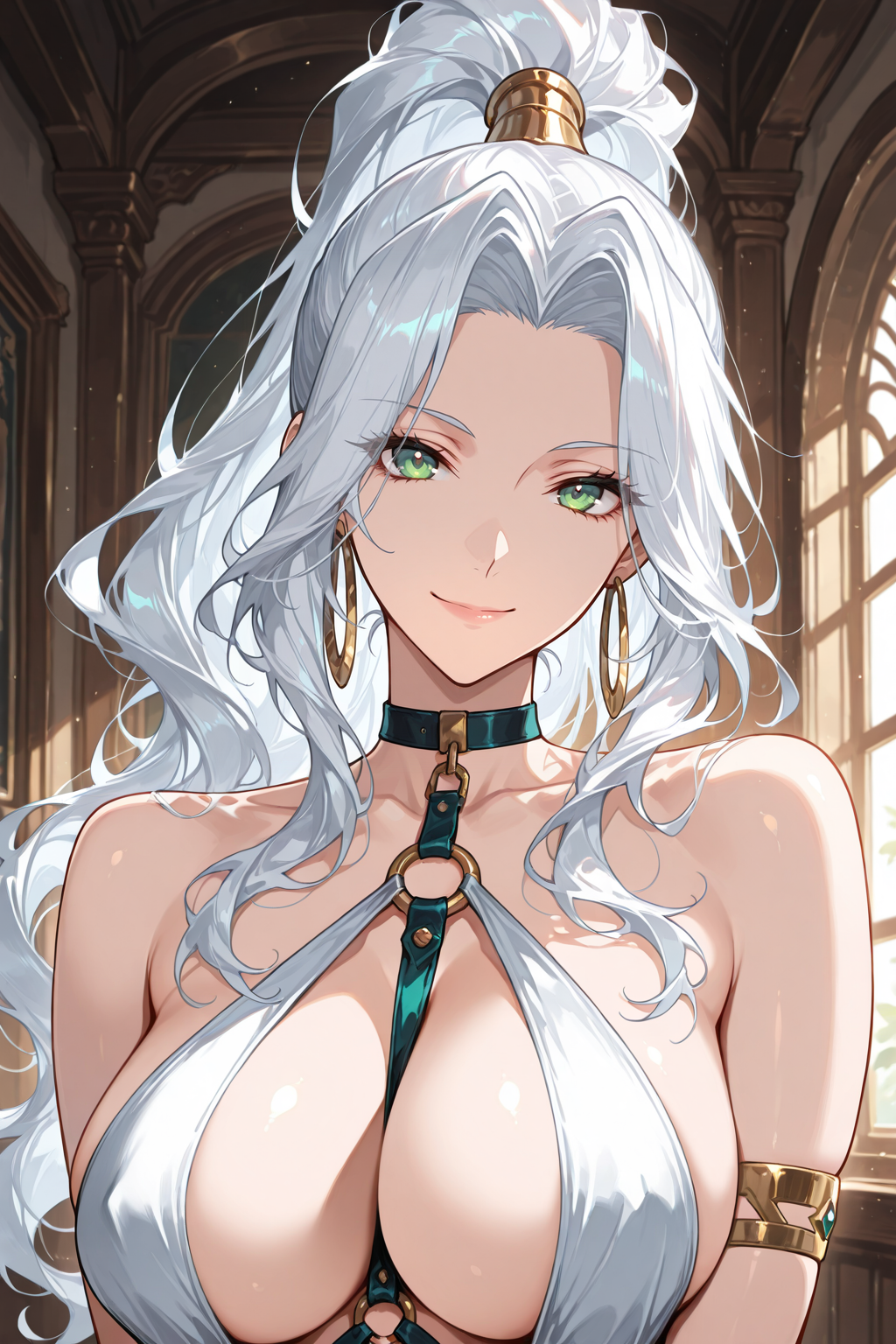 hoop earrings, bare shoulders, choker, o-ring, revealing clothes, white halterneck, strap between breasts, cleavage, cleavage cutout, no bra, armlet, navel, white pelvic curtain, black gloves, ankle boots, high heel boots