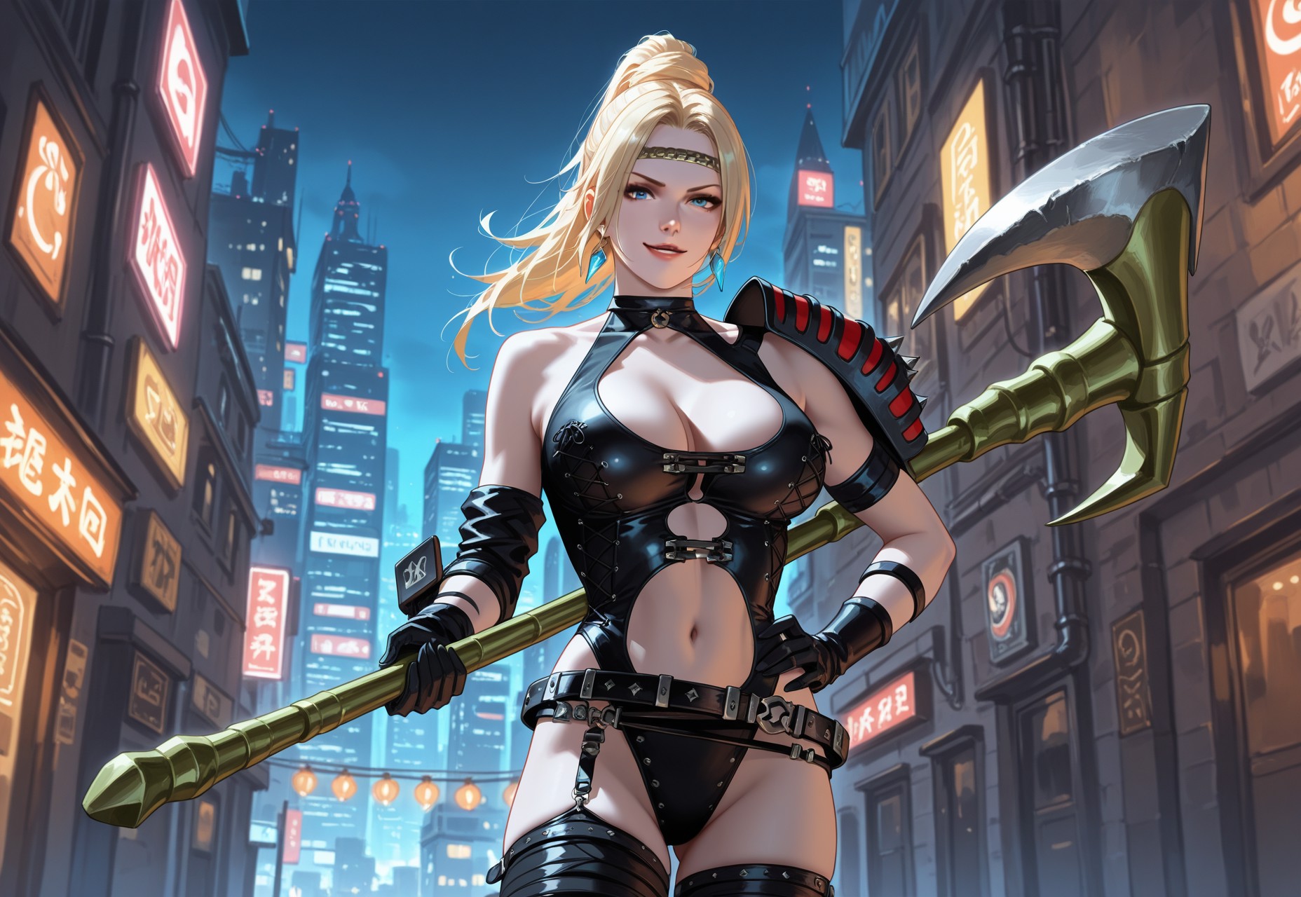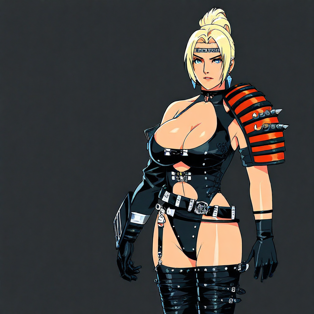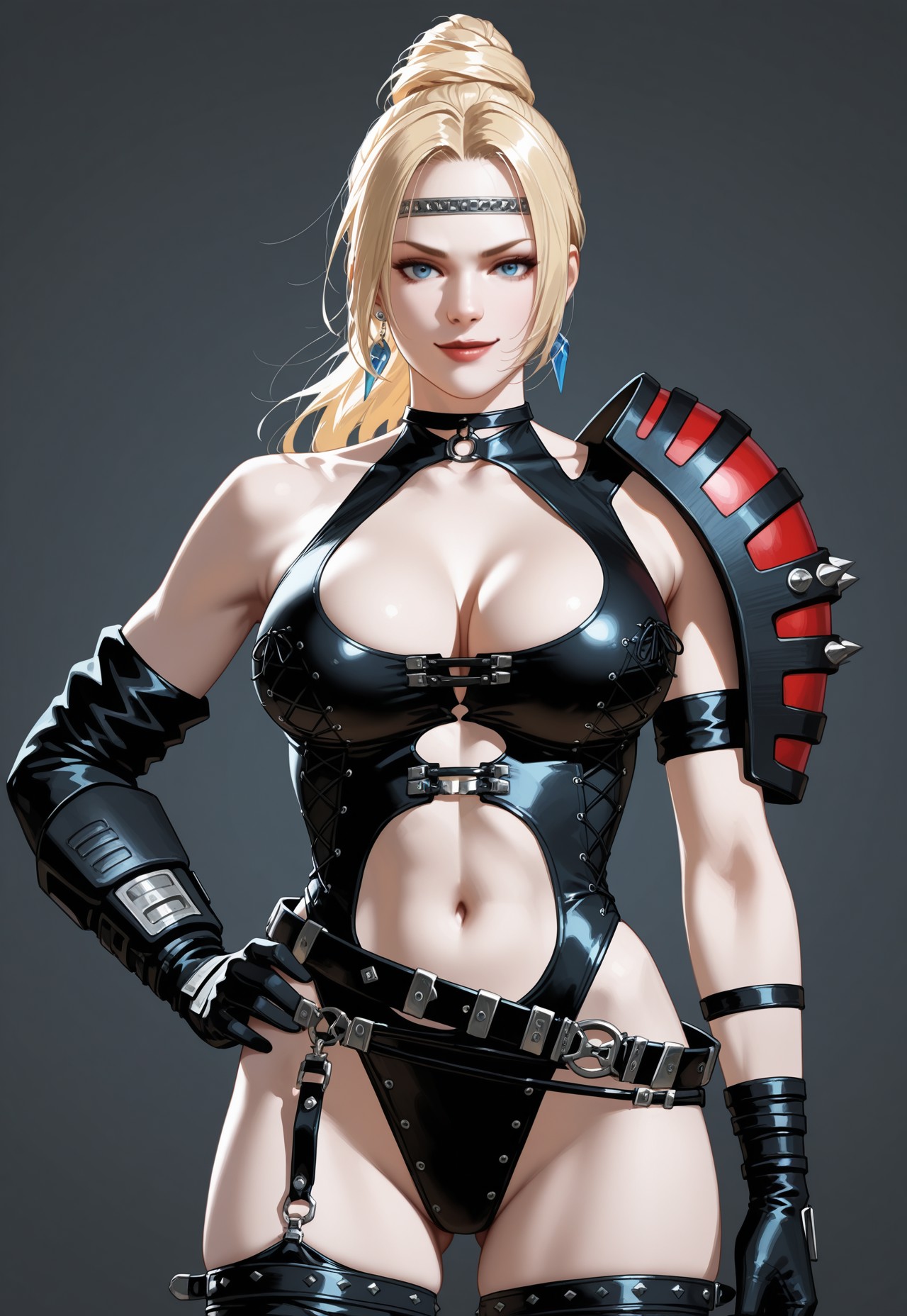 - headband, earrings, jewelry, blue eyes, choker, black leotard, clothing cutout, detached sleeve, gloves, single vambrace, single pauldron, armband, belt, garter strap, thighhighs, knee pads, boots, high heels,
