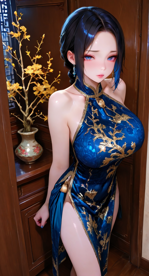 xg1, chinese clothes, sleeveless, luxurious sapphire blue modern cheongsam qipao, intricate golden phoenix and plum blossom embroidery
