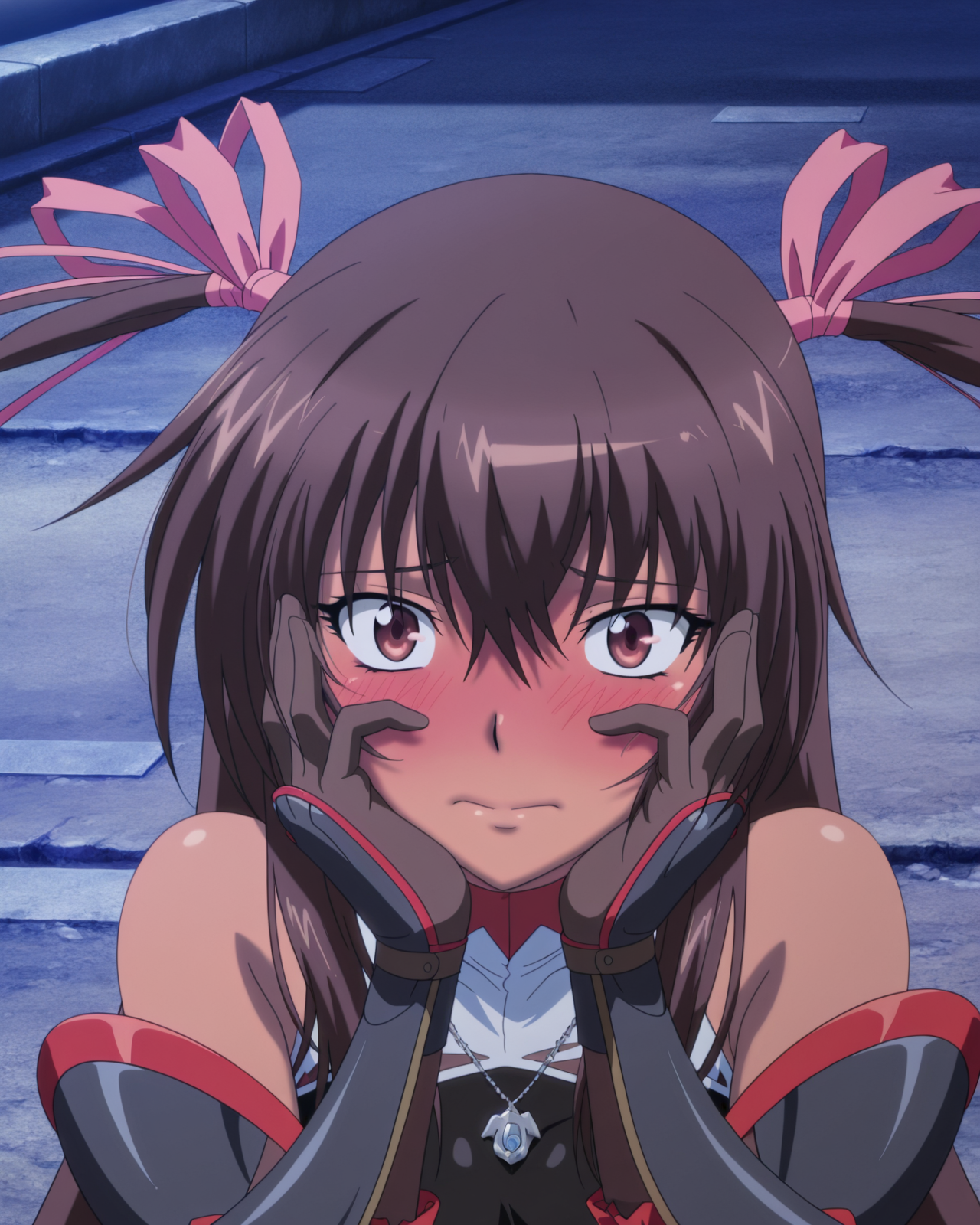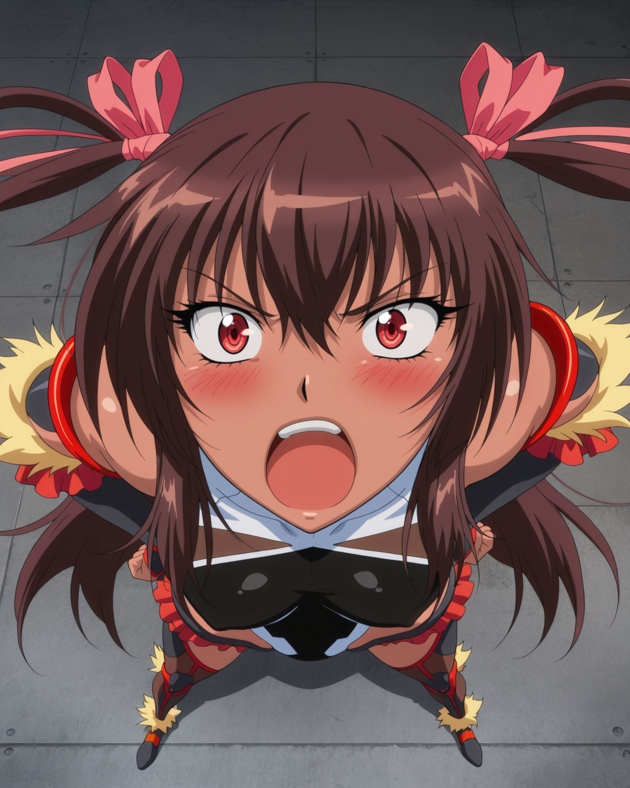 mizukiyukikazeova, 1girl, solo, long hair, brown hair, twin tails, hair ribbon, tan,