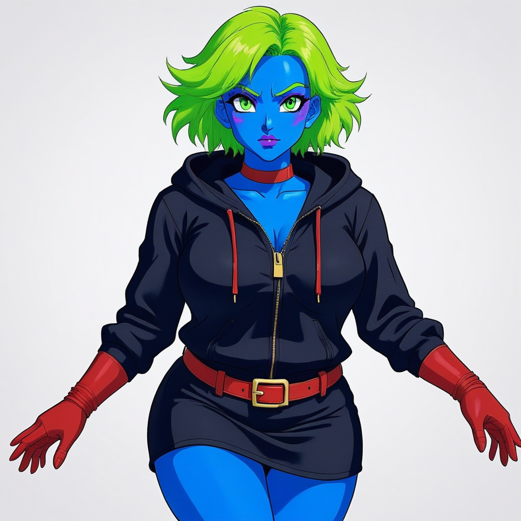 Example full-body positive prompt tags (copy-paste ready – add weights like (lime green hair:1.2) if needed): jodiblue, blue skin, cyan skin, bright blue skin, lime green hair, neon green hair, short hair, bob haircut, voluminous hair, messy hair, green eyebrows, matching hair color, large green eyes, emerald green eyes, detailed eyes, long eyelashes, purple eyeshadow, magenta eyeshadow, pink-purple makeup, purple lips, magenta lips, glossy lips, full lips, friendly expression, polite smile, soft smile, gentle look, warm expression, red choker, simple red choker, neck choker, black hoodie, hoodie hood, red hoodie drawstrings, red hoodie cords, zipped hoodie, deep cleavage, large breasts, cleavage, black skirt, short skirt, above knee skirt, red belt, red belt with yellow buckle, gold belt buckle, long red gloves, elbow length red gloves, red armwear, red knee high boots, red thigh high boots, standing, full body, looking at viewer, anime style, anime girl, vibrant colors, cel shading, clean lines, sharp outlines, high detail, masterpiece