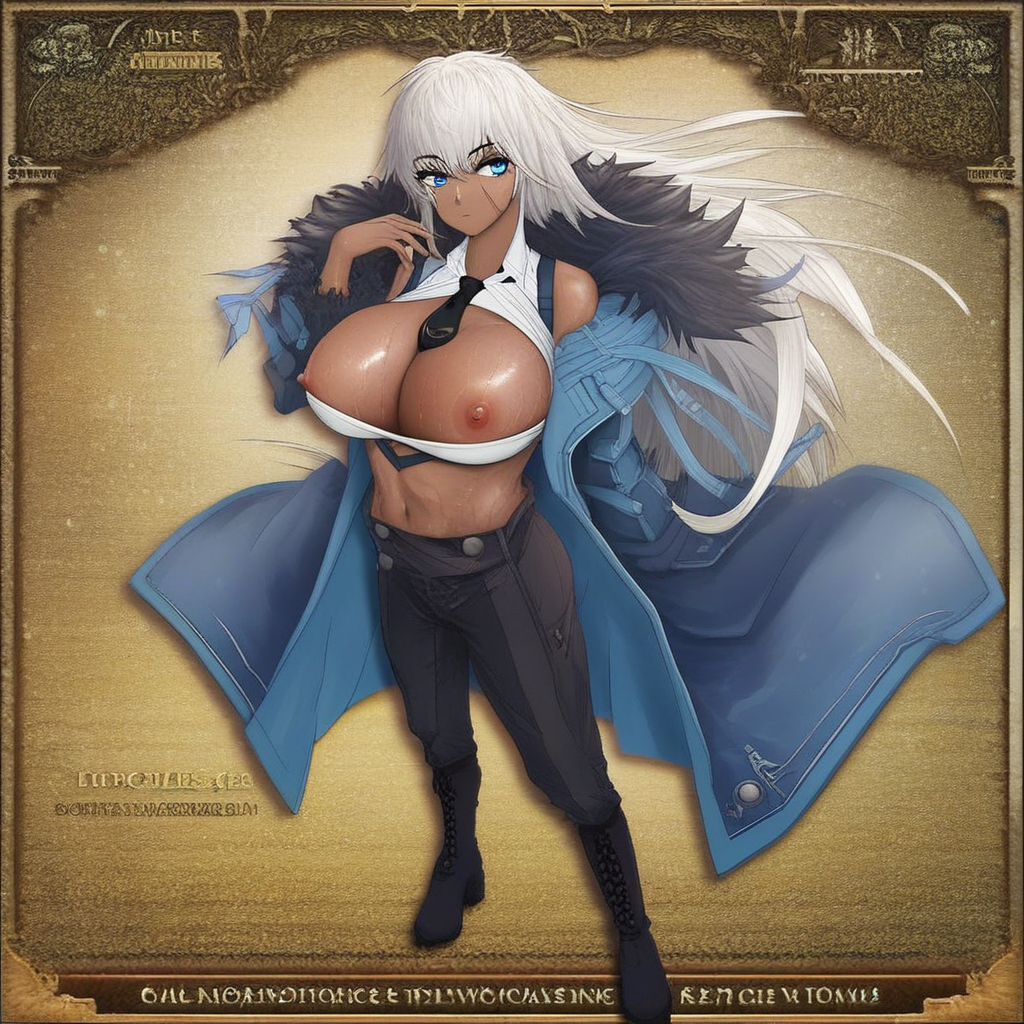 (Azur_Indiana, outfit1, long hair, white hair, blue eyes, dark skin, dark-skinned female, jewelry, scar, coat, fur trim, necktie, shirt, cleavage, clothing cutout, pants, boots),