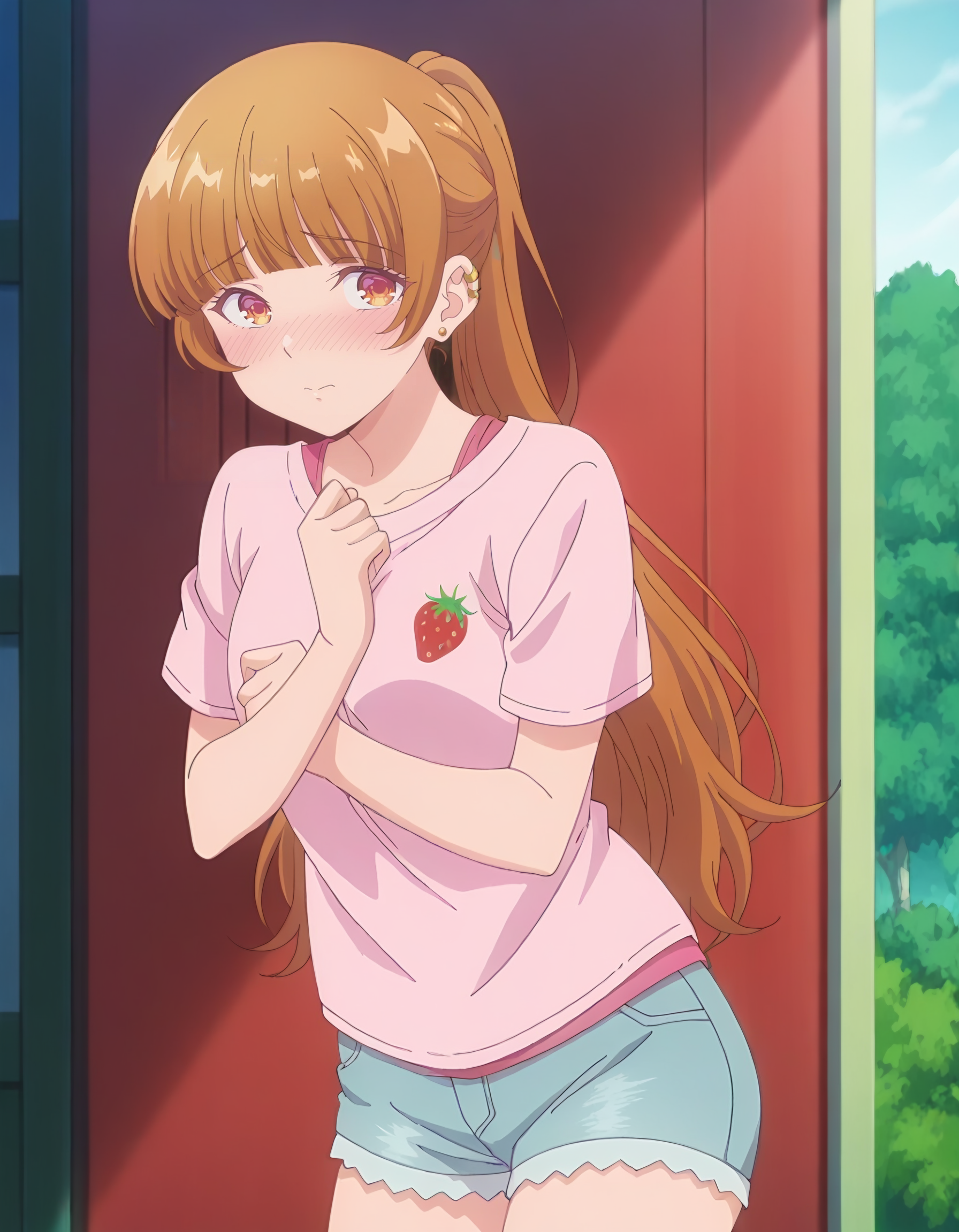 outfit 2: yellow shirt, pink shorts, pink jacket, long sleeves, pajamas, hooded jacket, hood down, open clothes, bare legs, short shorts,hoodie,