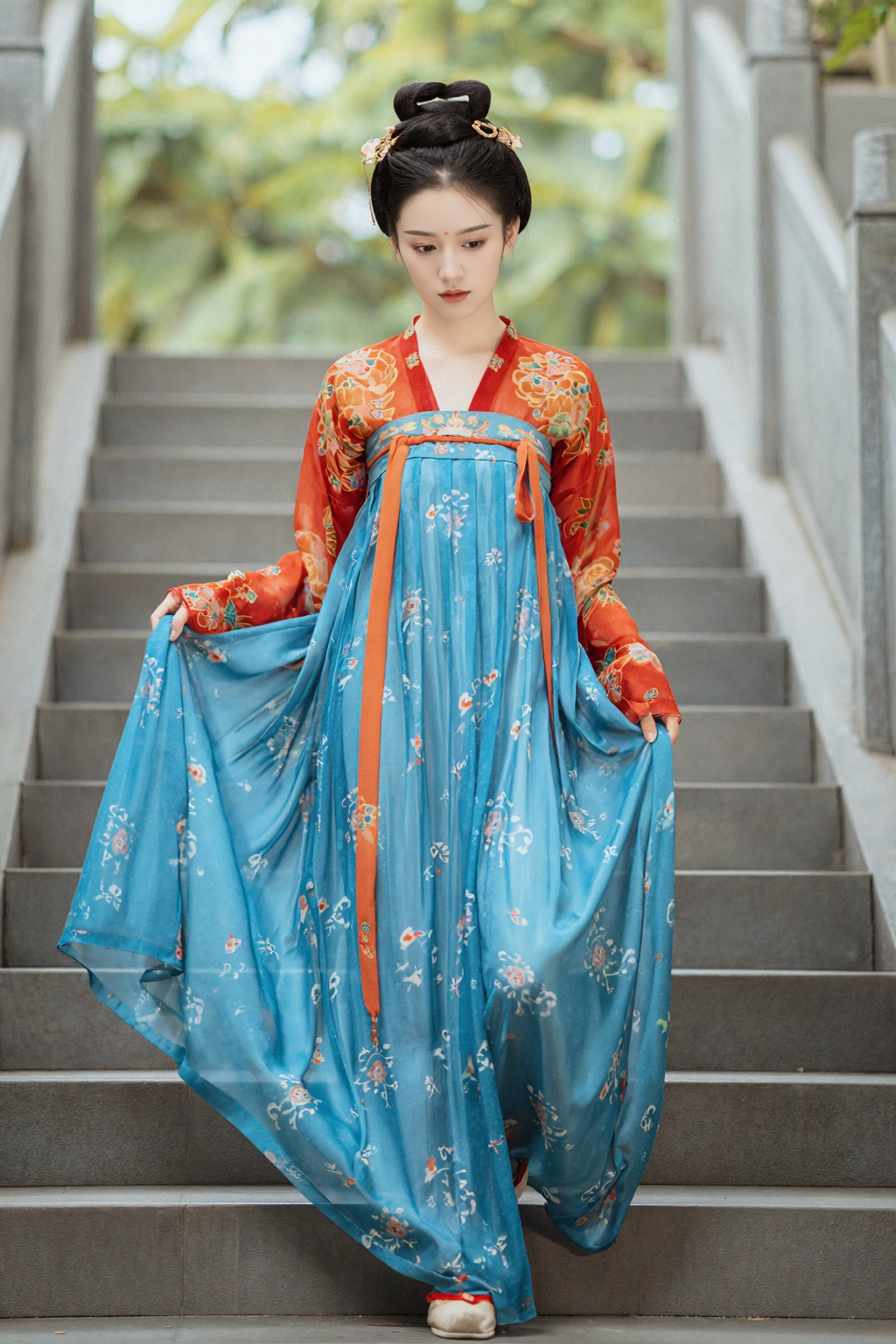 中国少女, wearing hanfu Tang_QiXiong_ShanQun, 带红色边缘的简洁白色上衣, 渐变红色袖子, 带花纹的红色加橙色裙子, 白色系带