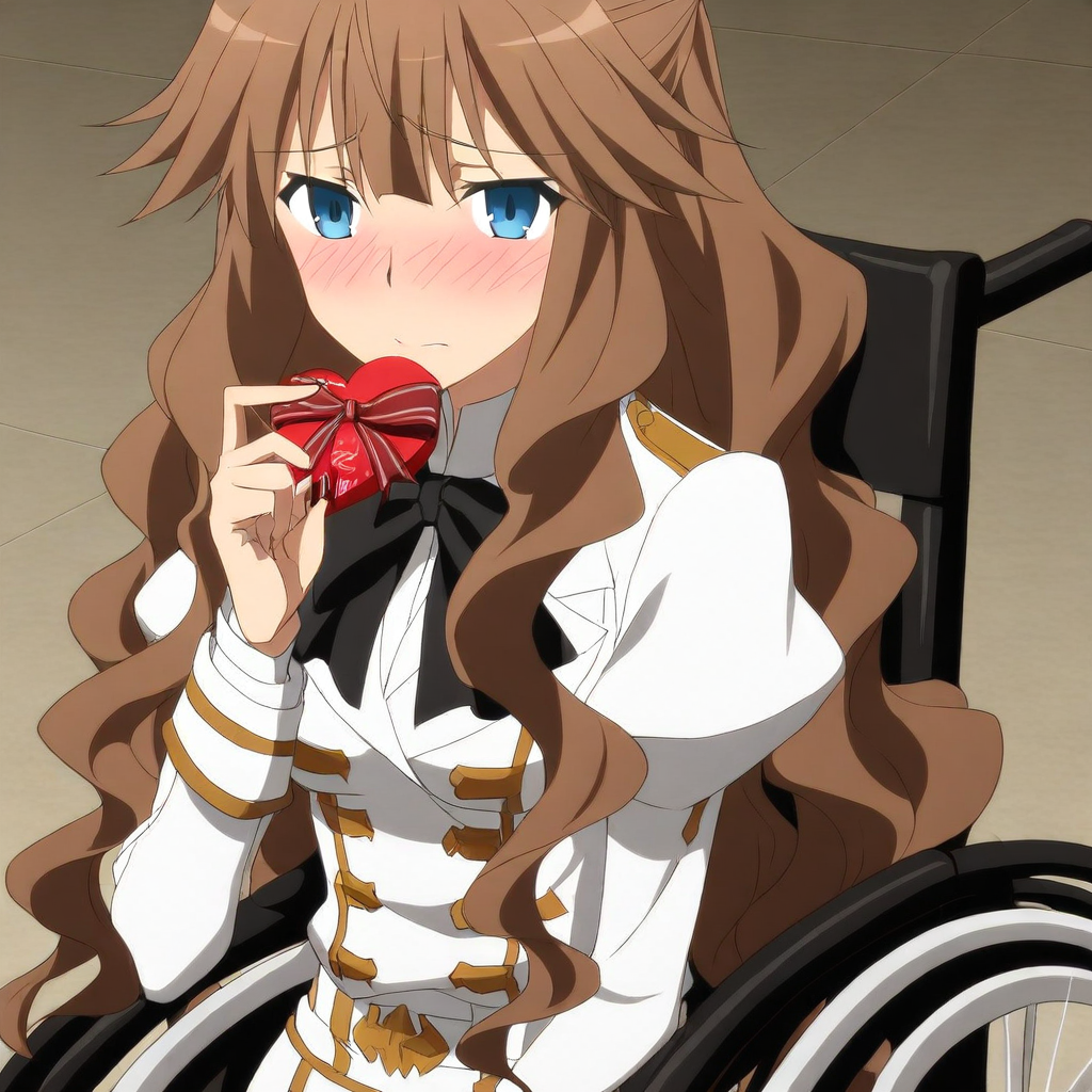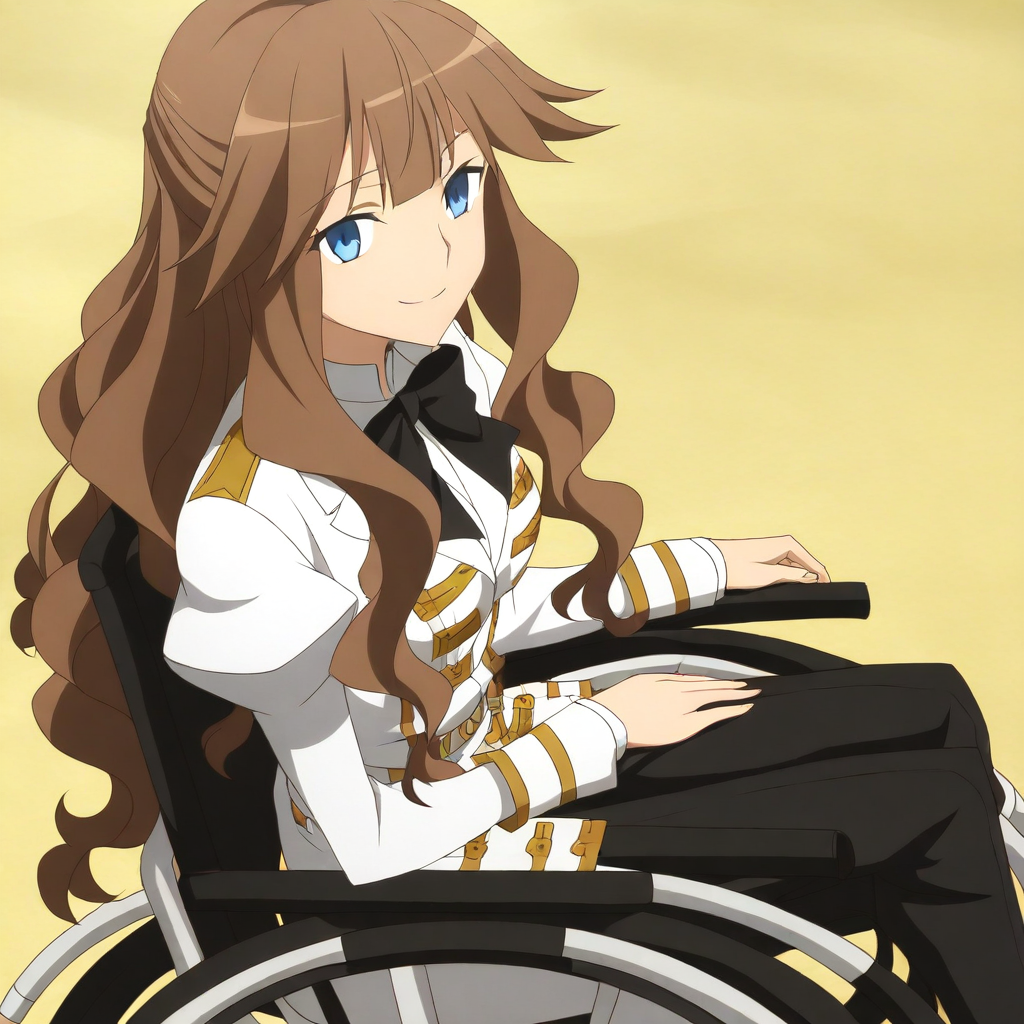 fiore forvedge yggdmillennia \(fate\), light brown hair, long hair, sidelocks, bangs, blue eyes, military uniform, skirt, bow, black pants, socks, heels, wheelchair, large breasts, 1girl, solo